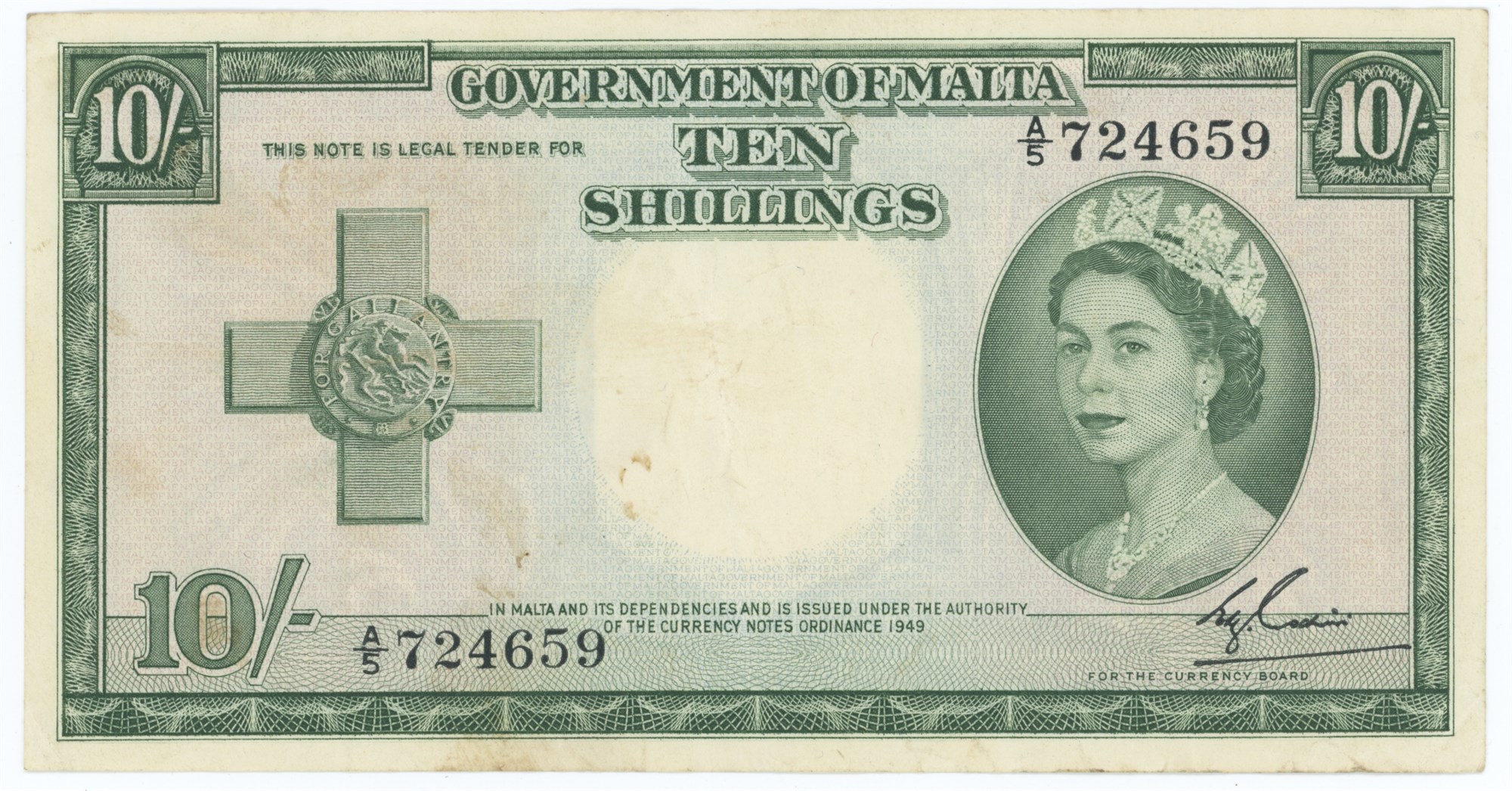 10 Shillings 1949, no. A/5 724659, some dirt.