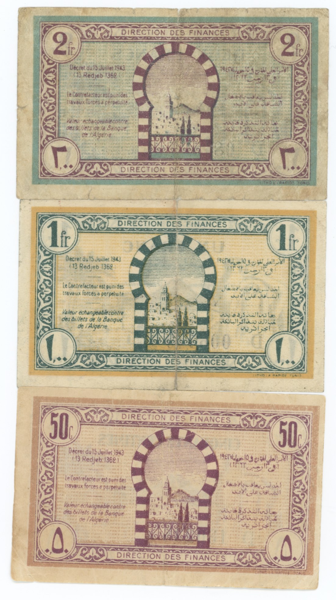 50 Centimes, 1 Franc, 2 Francs, 1943. (3)