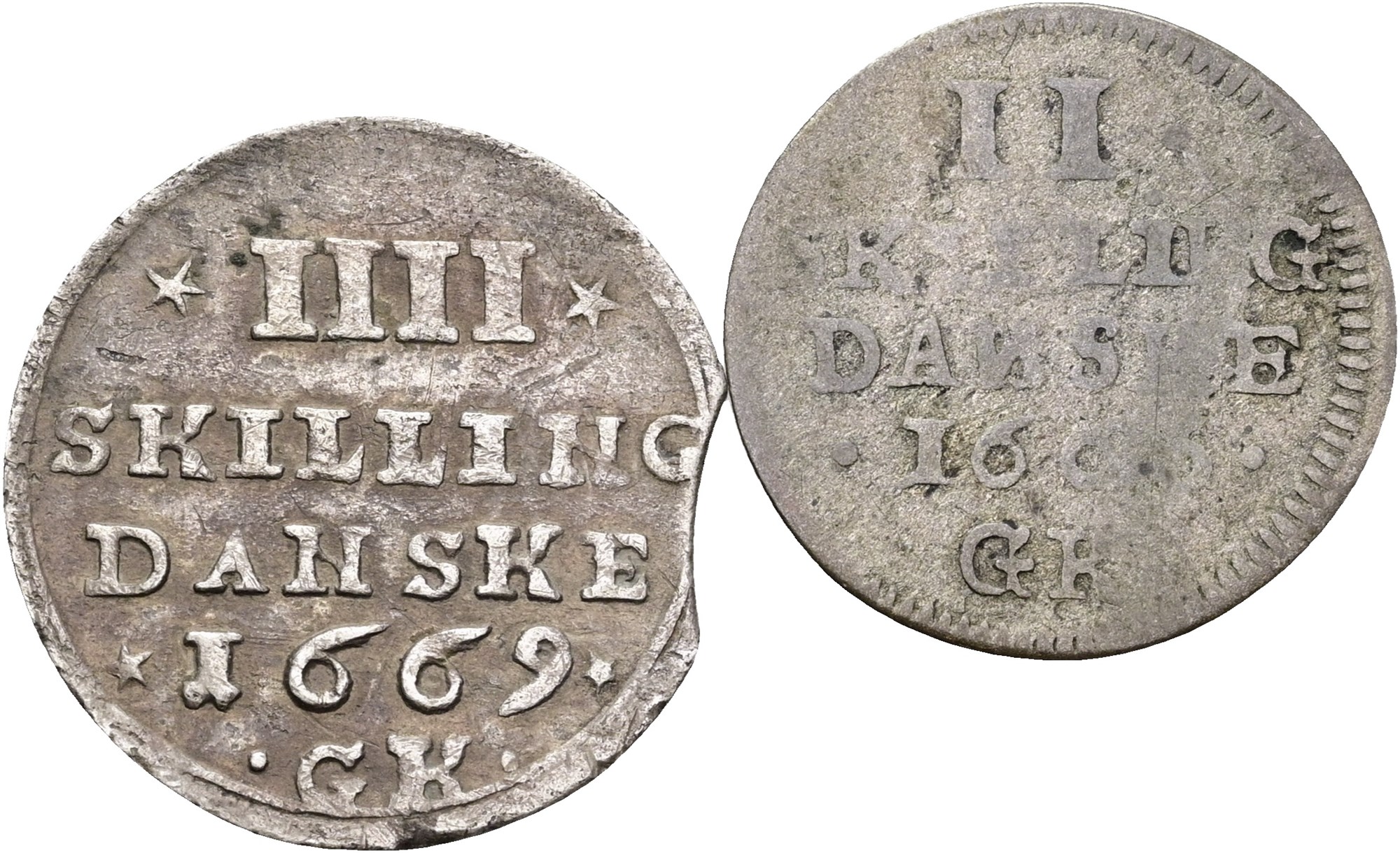 2 skilling 1665 samt 4 skilling 1669. (2)