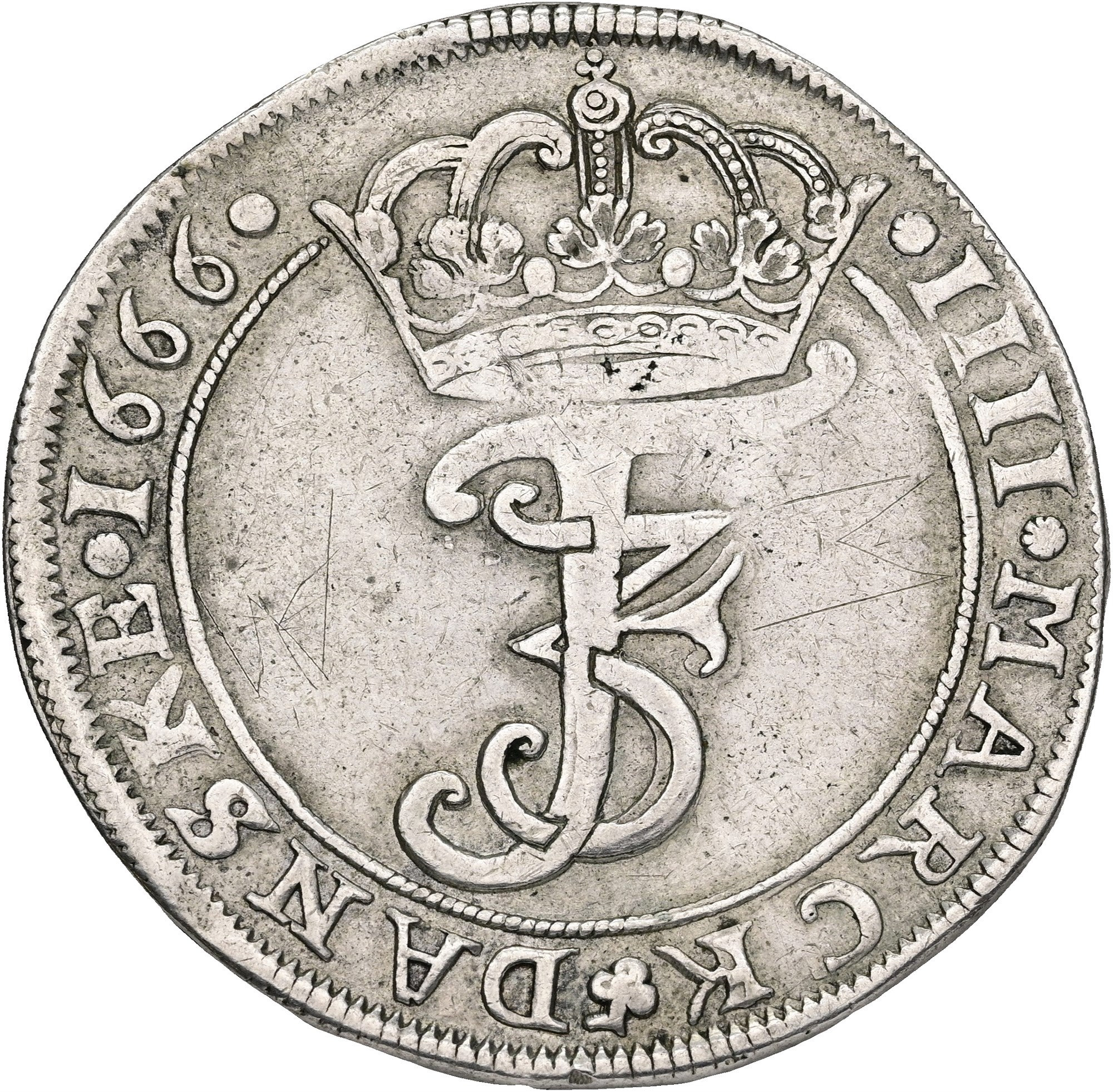 4 mark / krone 1666, graffiti på avers.