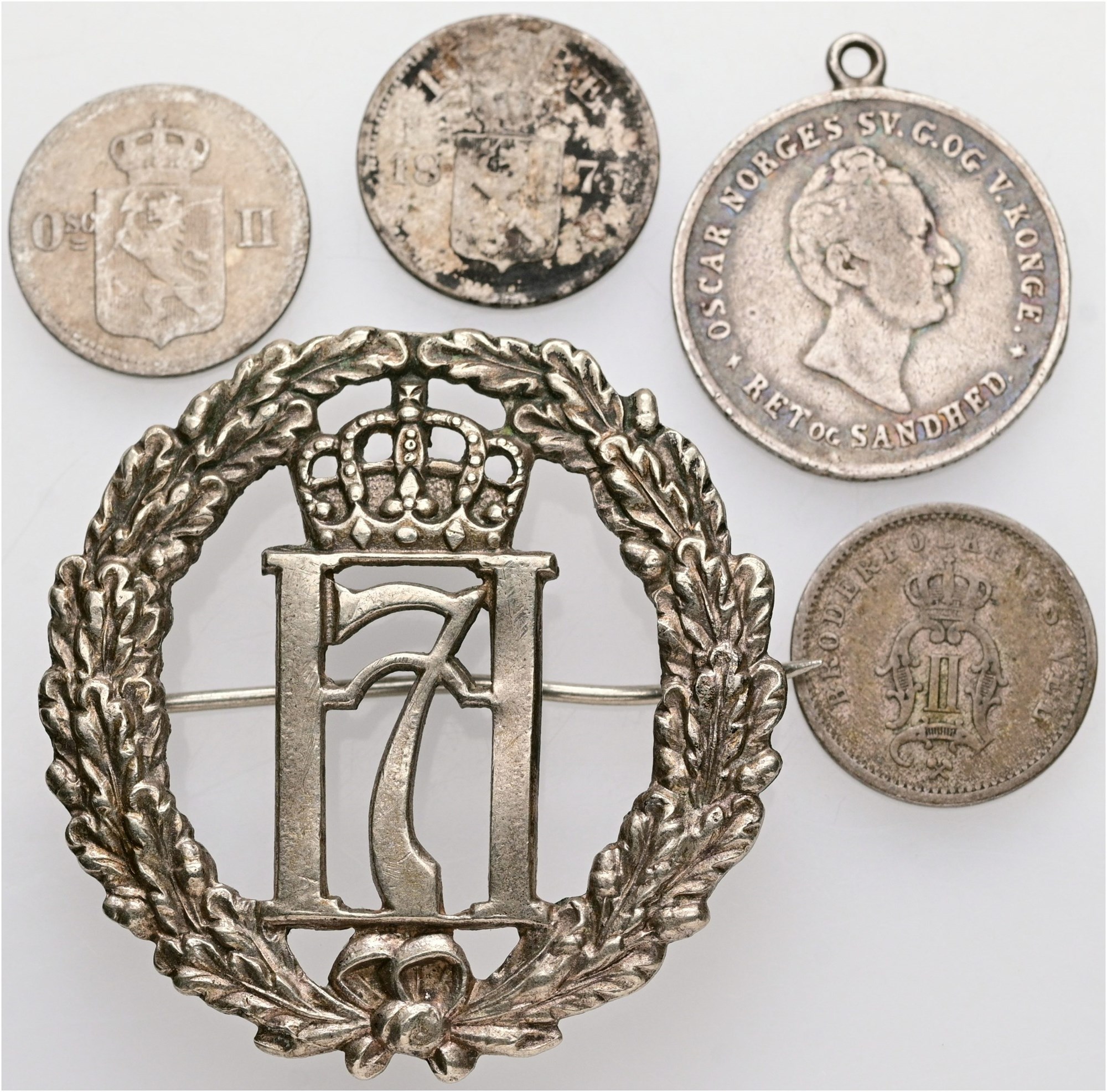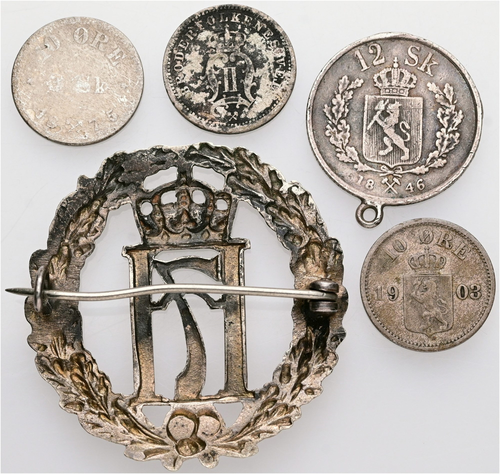 12 skilling 1846; 3 skilling / 10 øre 1875; 10 øre 1875, 1903; Haakon VII, badge, Ae, 36 mm, 5,88 g. Flere med skader. (5)