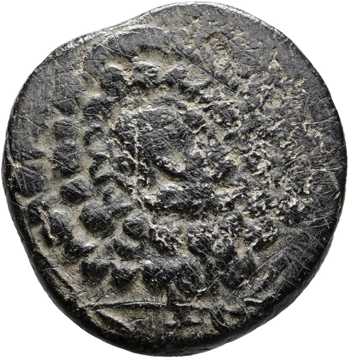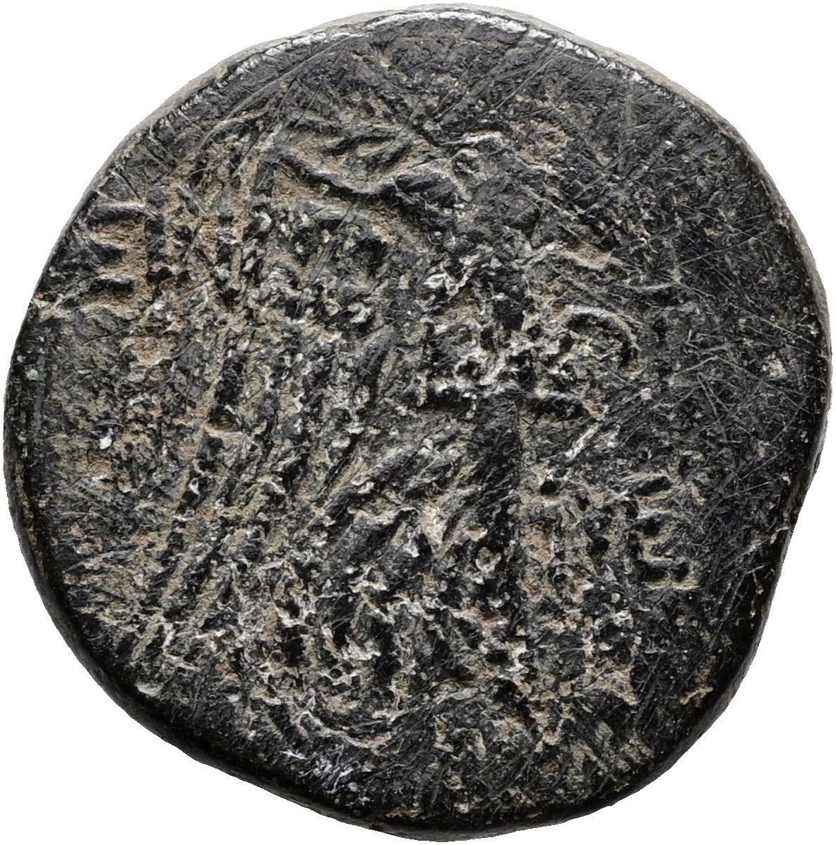 Bronze, 21 mm, facing head of Medusa / Nike advancing right holding palm branch.