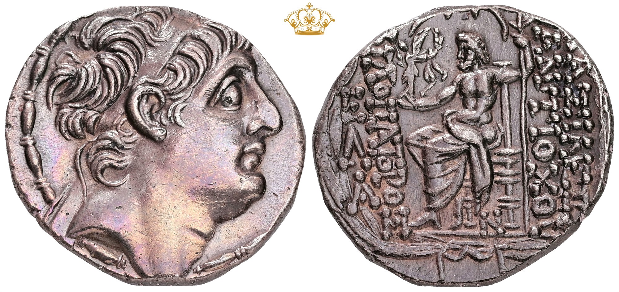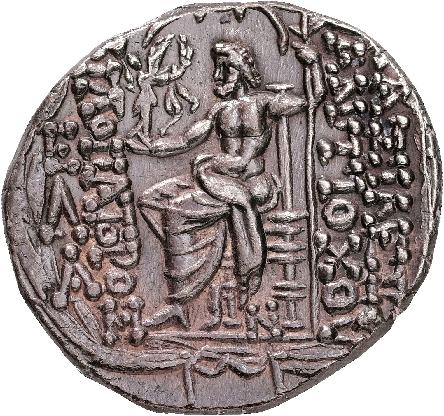 Seleukid Empire, Tetradrachm. Diademed head of Antiochos IX to right. Rev. BAΣIΛEΩΣ ANTIOXOY / ΦΙΛΟΠATOPOΣ, Zeus seated to left, holding Nike in outstretched right hand and long sceptre in left. Lightly cleaned.