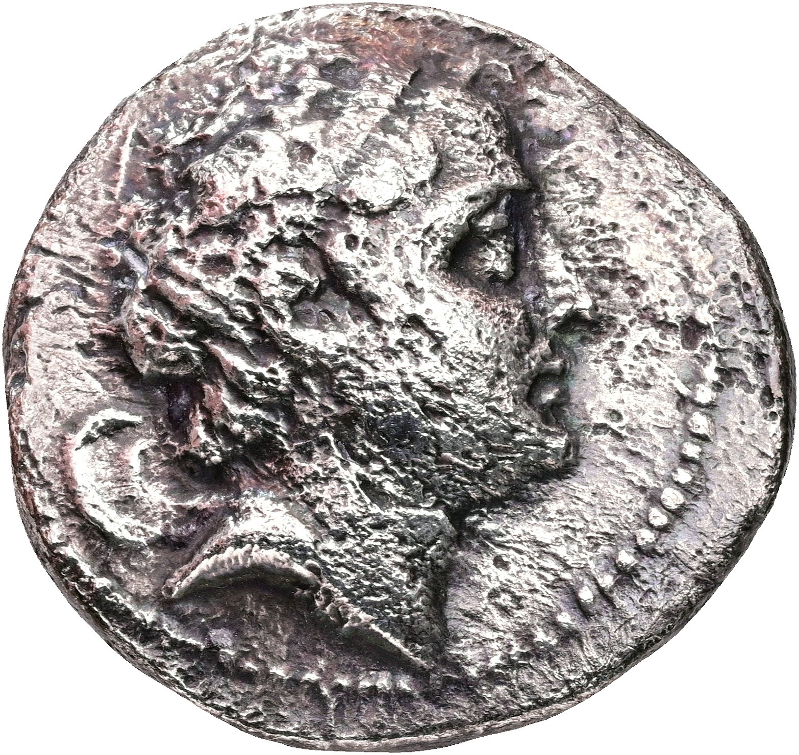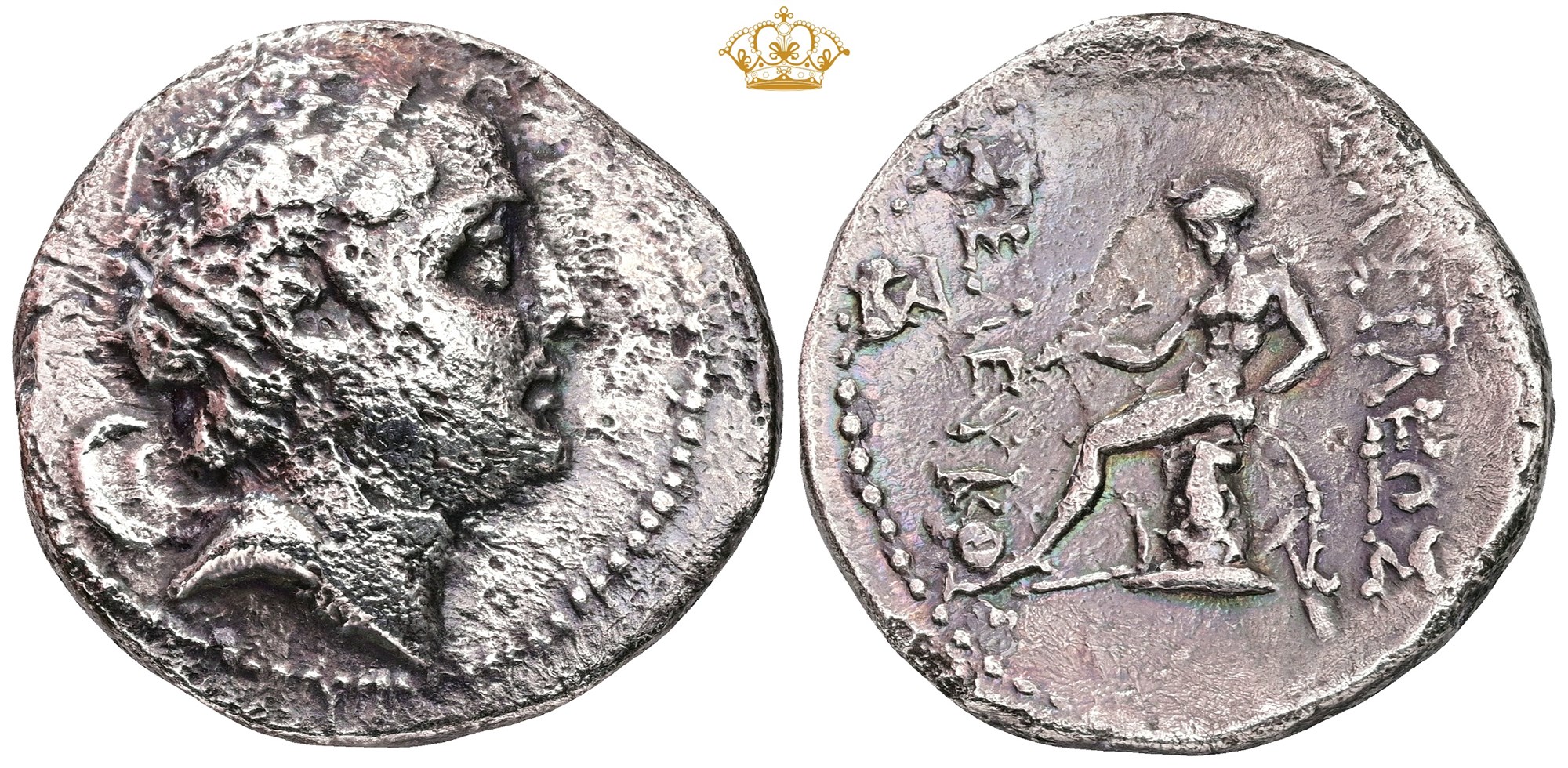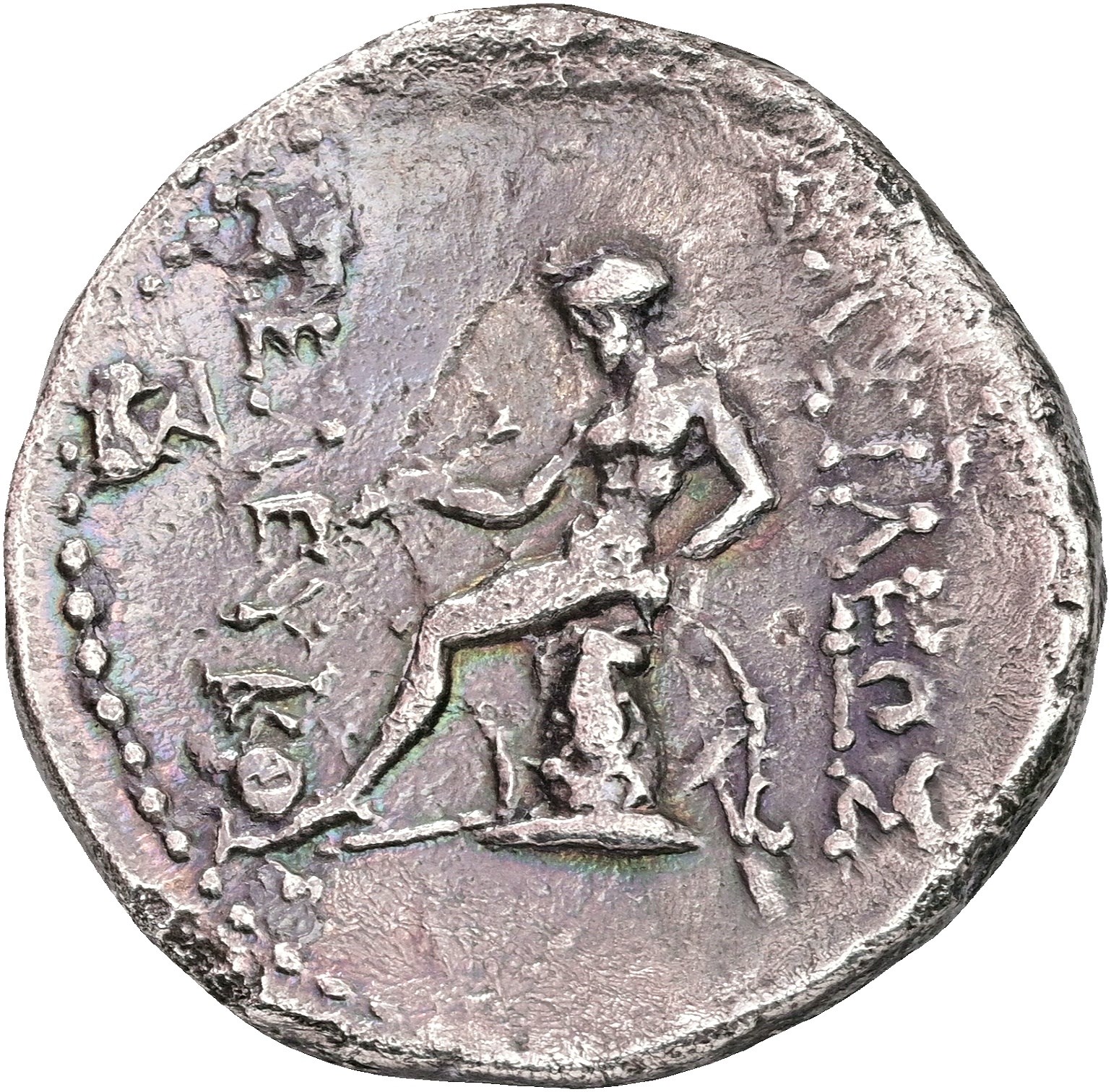 Seleukid Empire, Tetradrachm. Antioch on the Orontes. Diademed head of Seleukos IV to right. Rev. BAΣIΛEΩΣ ΣEΛEYKOY Apollo seated to left on omphalos, holding arrow in his right hand and resting his left on grounded bow; to outer left field, filleted palm. Corr., cleaned.