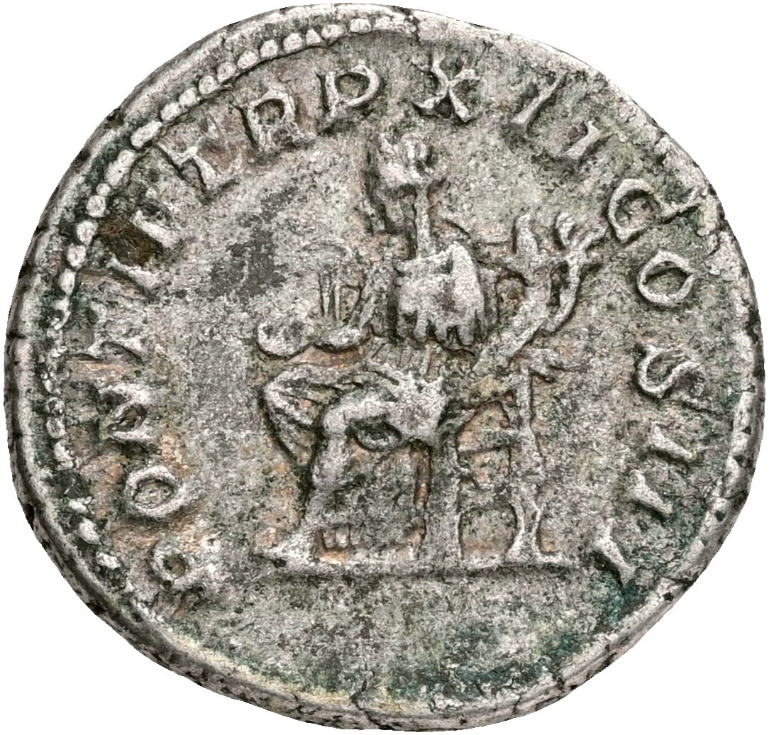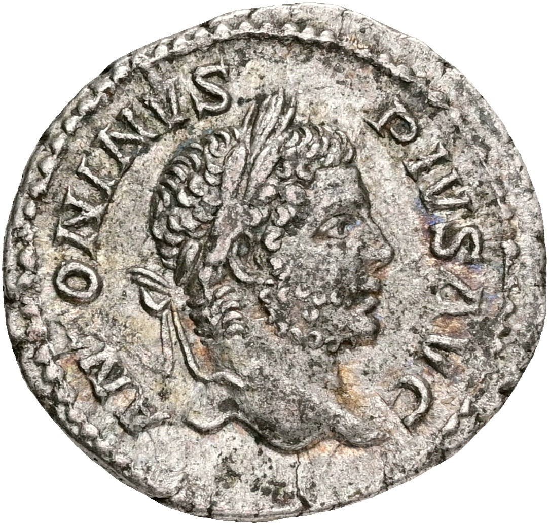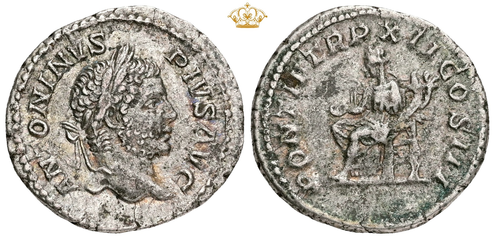 Denarius, c. 209 AD. Rome. ANTONINVS PIVS AVG, laureate head of Caracalla to right. Rev. PONTIF TR P XII COS III, Concordia seated left, holding patera in her right hand and double cornucopiae in her left.