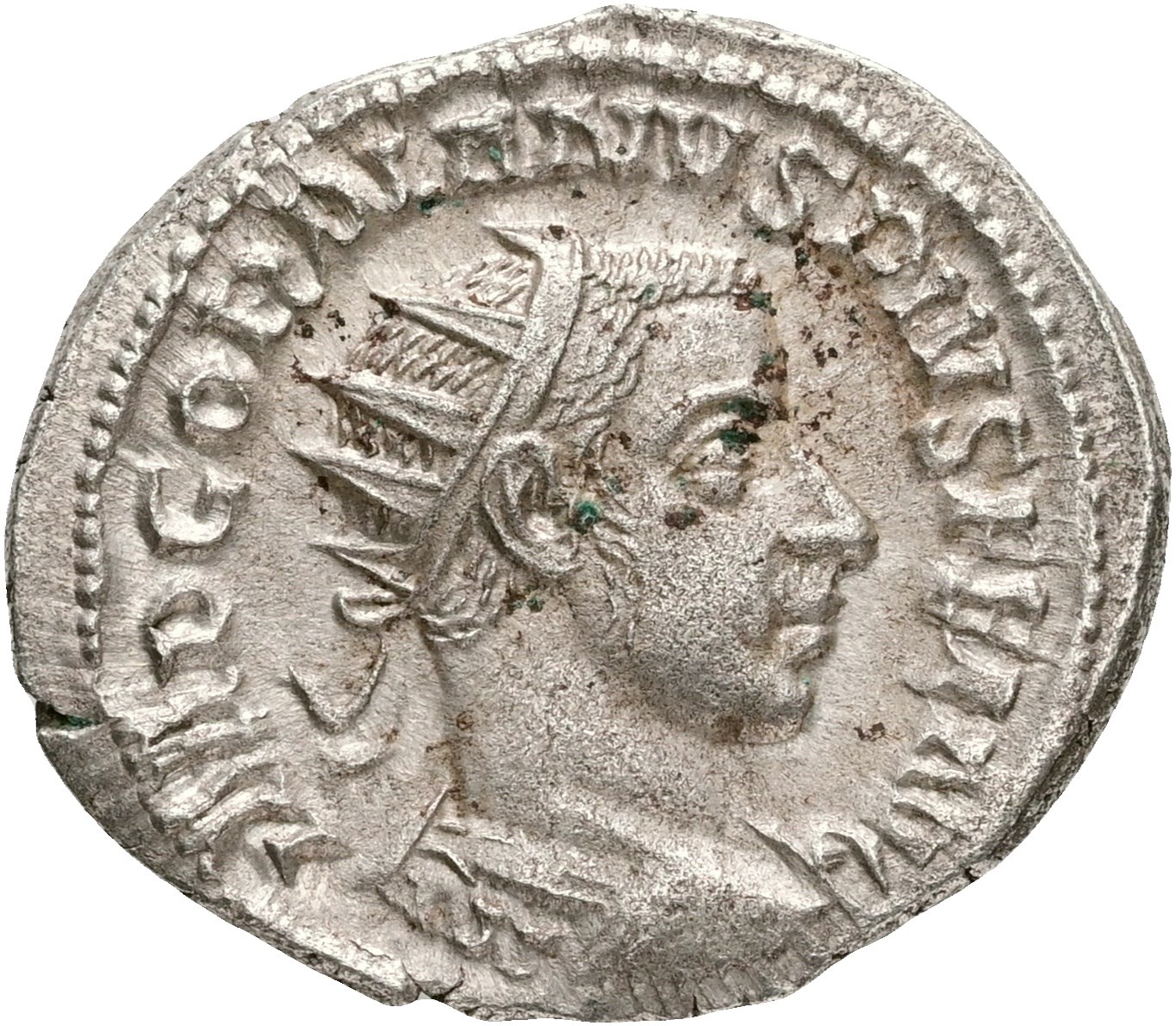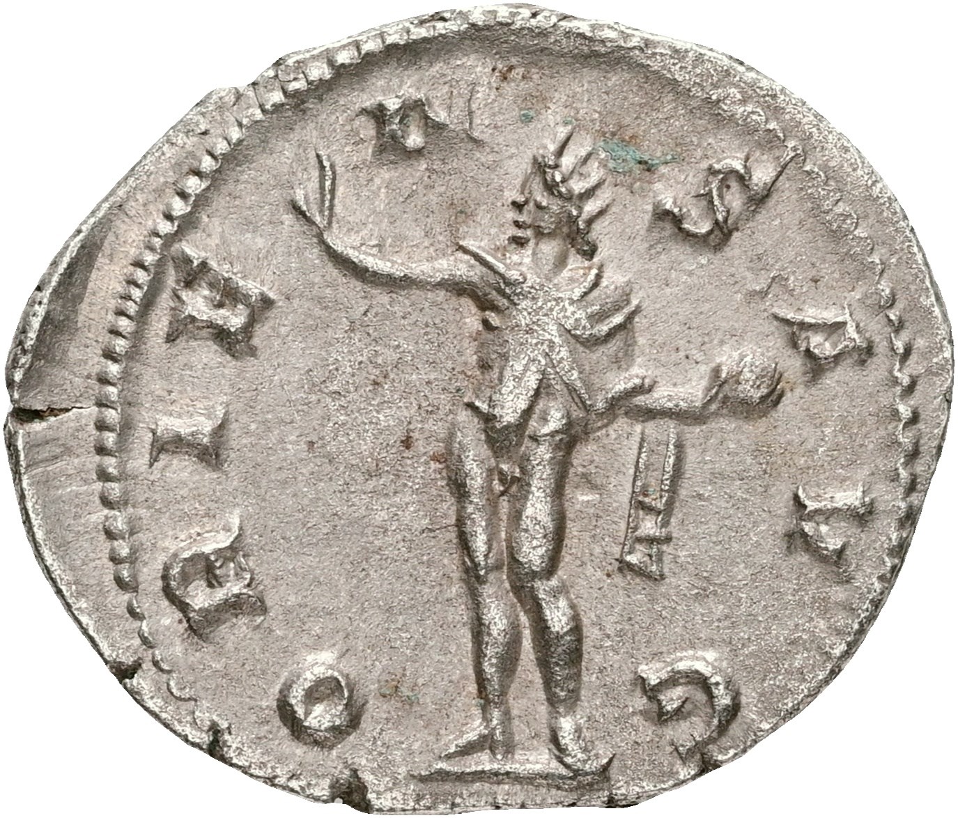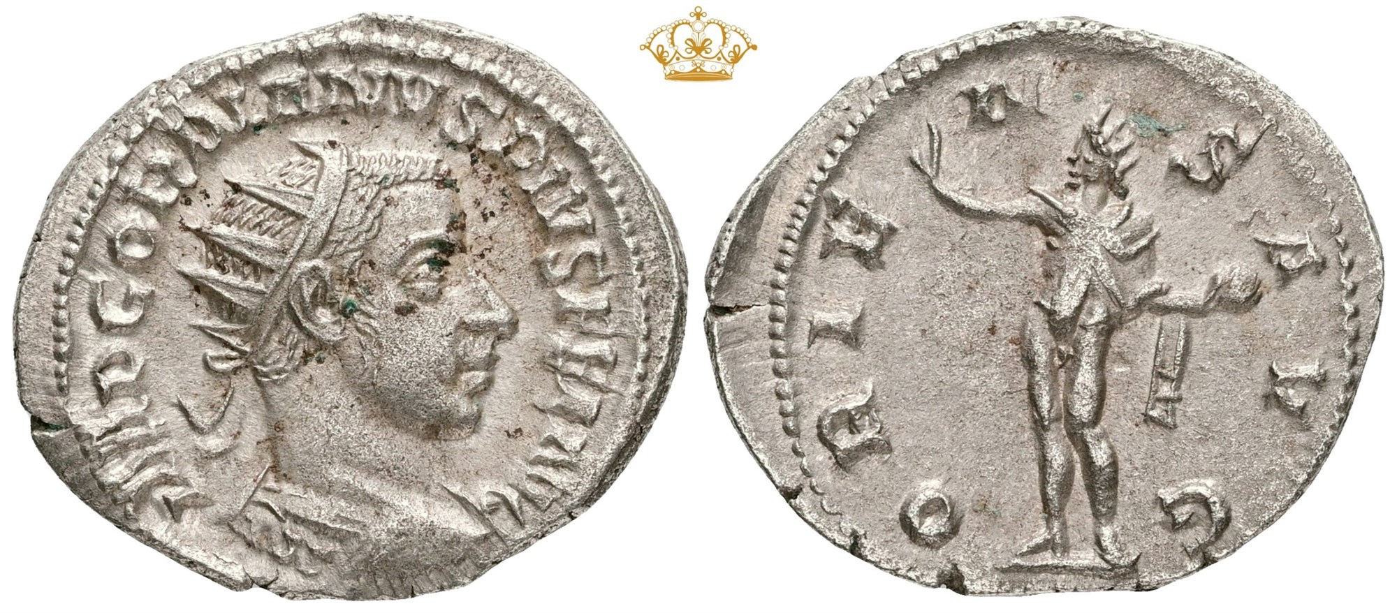 Antoninianus, 242-244 AD, Antioch. Obv: IMP GORDIANVS PIVS FEL AVG, radiate and cuirassed bust right. Rev; ORIENS AVG, Sol standing left, holding globe and raising hand.