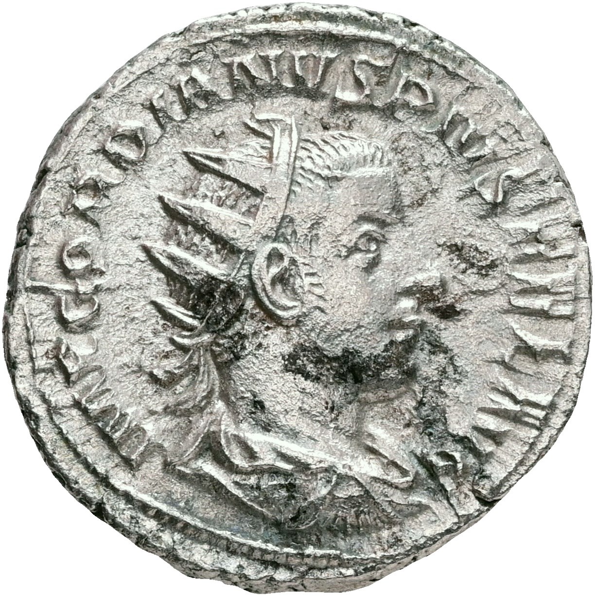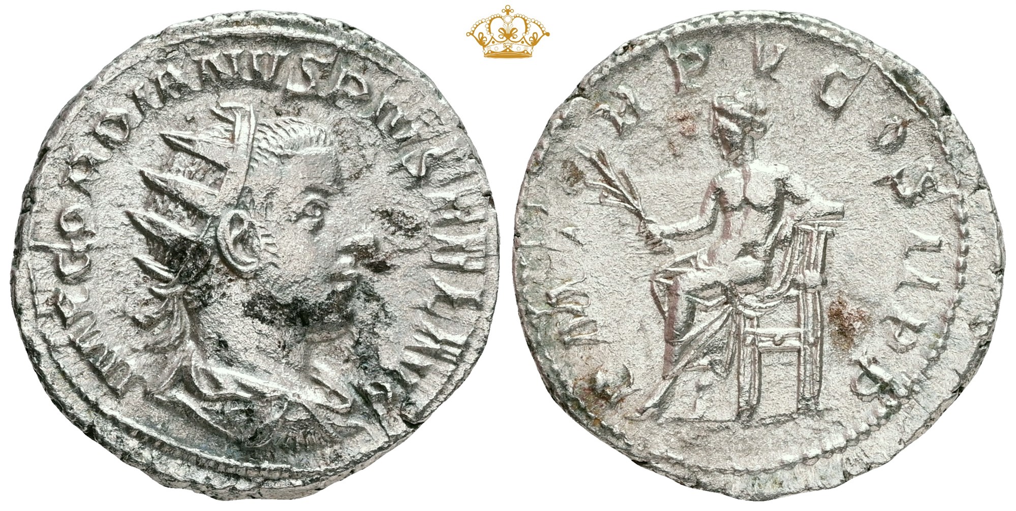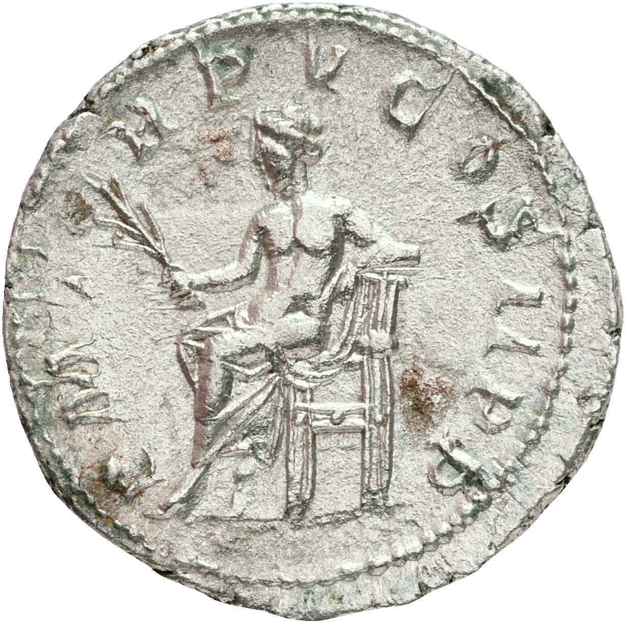 Antoninianus, 242 AD, Rome. IMP GORDIANVS PIVS FEL AVG Radiate, draped and cuirassed bust of Gordian III to right, seen from behind. Rev. P M TR P V COS II P P Apollo seated left, holding branch in his right hand and leaning his left on lyre set on seat. Some corr., cleaned.
