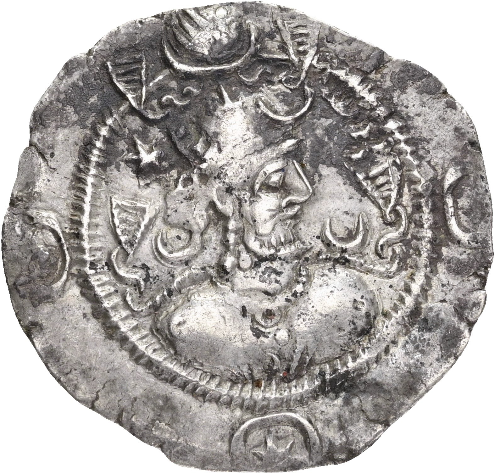 Drachm, year 14. Crowned bust right / Fire altar; attendants flanking.