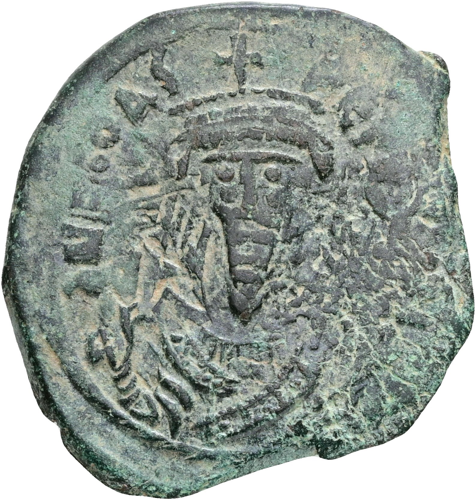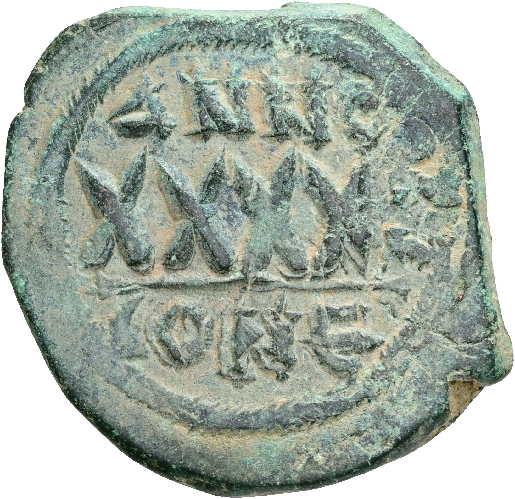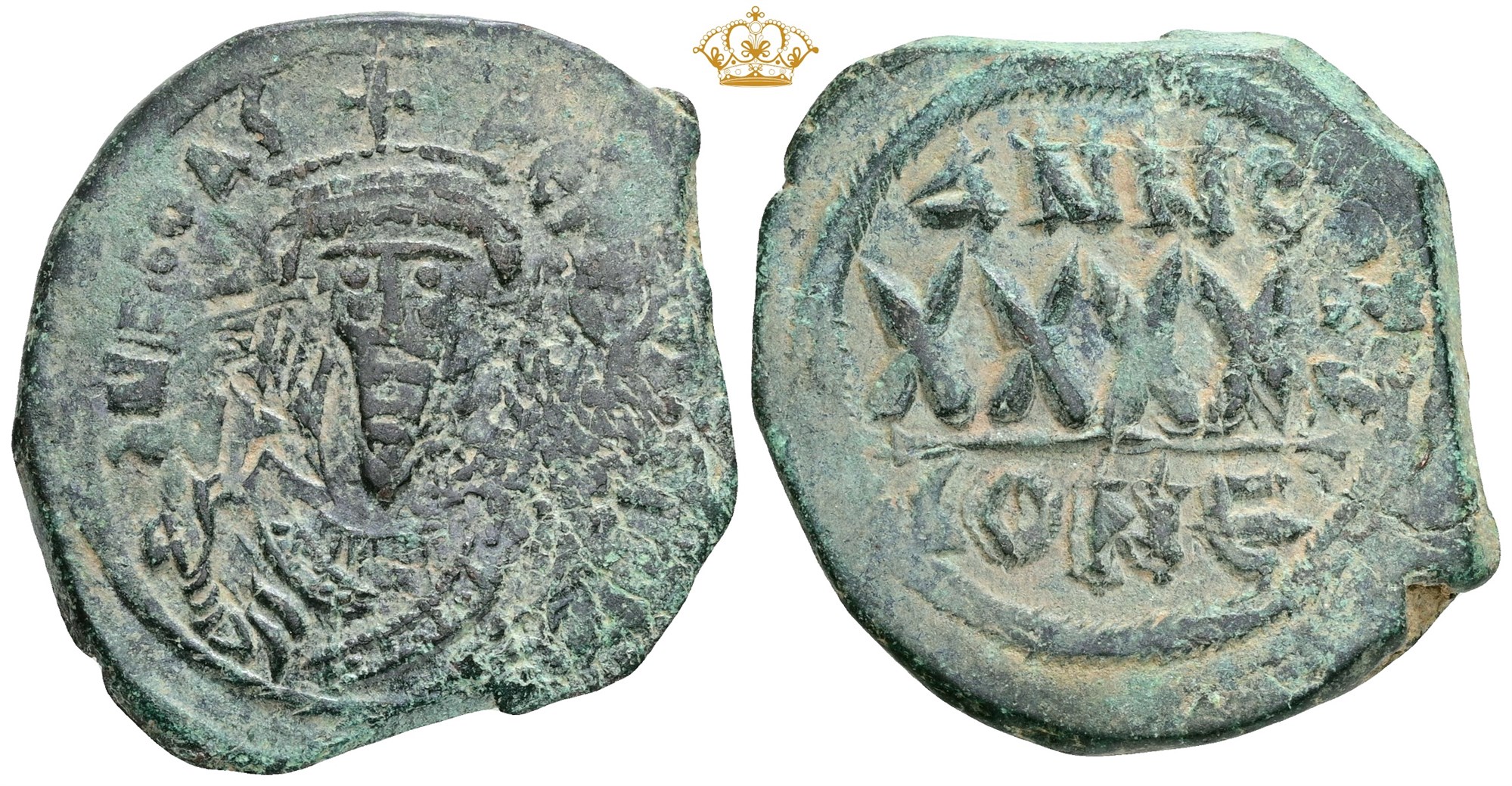 40 Nummi, Constantinople. Struck 608-609 AD. Crowned bust facing, wearing consular robes, holding mappa and cross / Large XXXX; ANNO above; CONE in exergue.