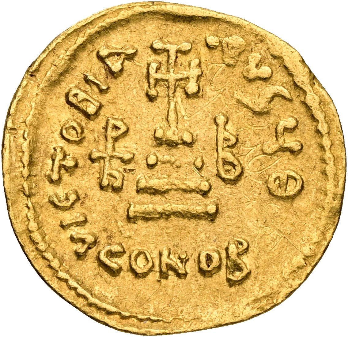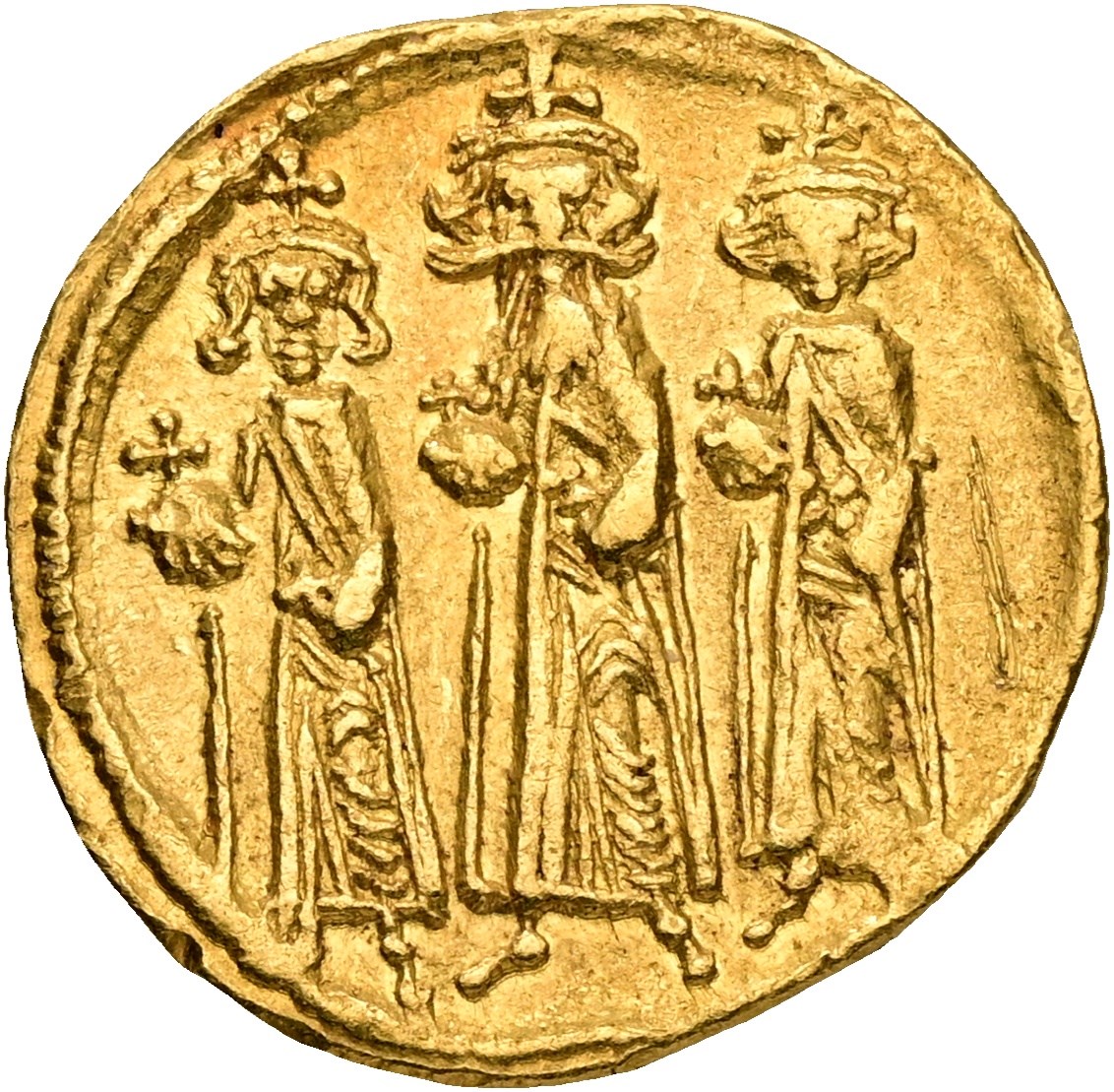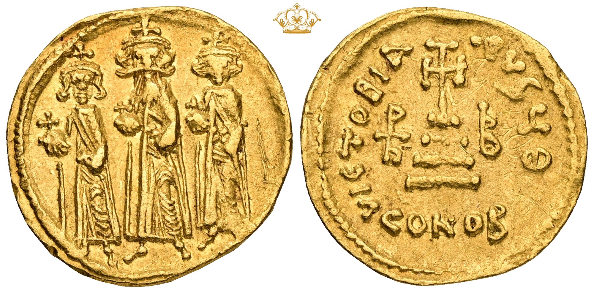 Solidus, Constantinople, 7th officina, dated Indictional Year 12 (AD 638/9). Heraclius (in center), with long beard and mustache, Heraclius Constantine (on right), beardless, and Heraclonas (on left), beardless, standing facing, each wearing chlamys and crown surmounted by cross, with globus cruciger in right hand / VICTORIA-AVϚЧ Z (Z retrograde), cross potent on three steps; complex monogram in left field, BI monogram in right field, CONOB in exergue.