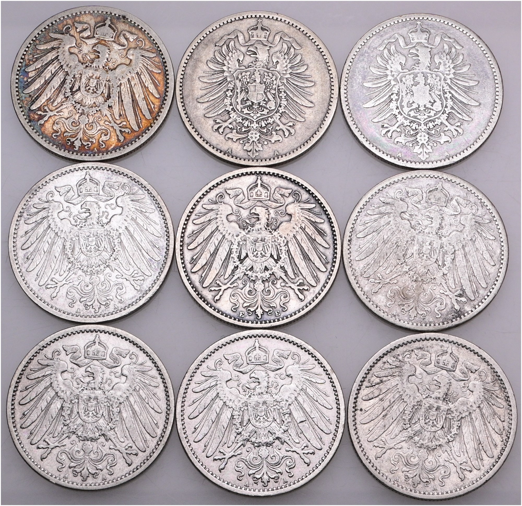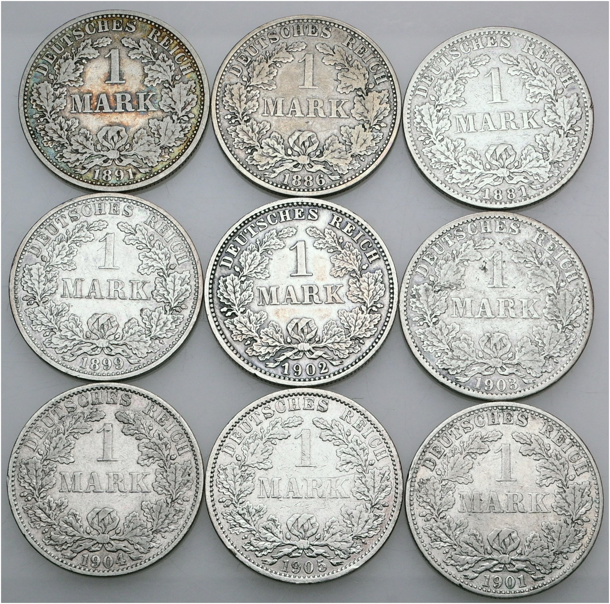 Mark 1881 A, 1886 A, 1891 A, 1899 A, 1901 A, 1902 E, 1903 A, 1904 A, 1905 A. (9)