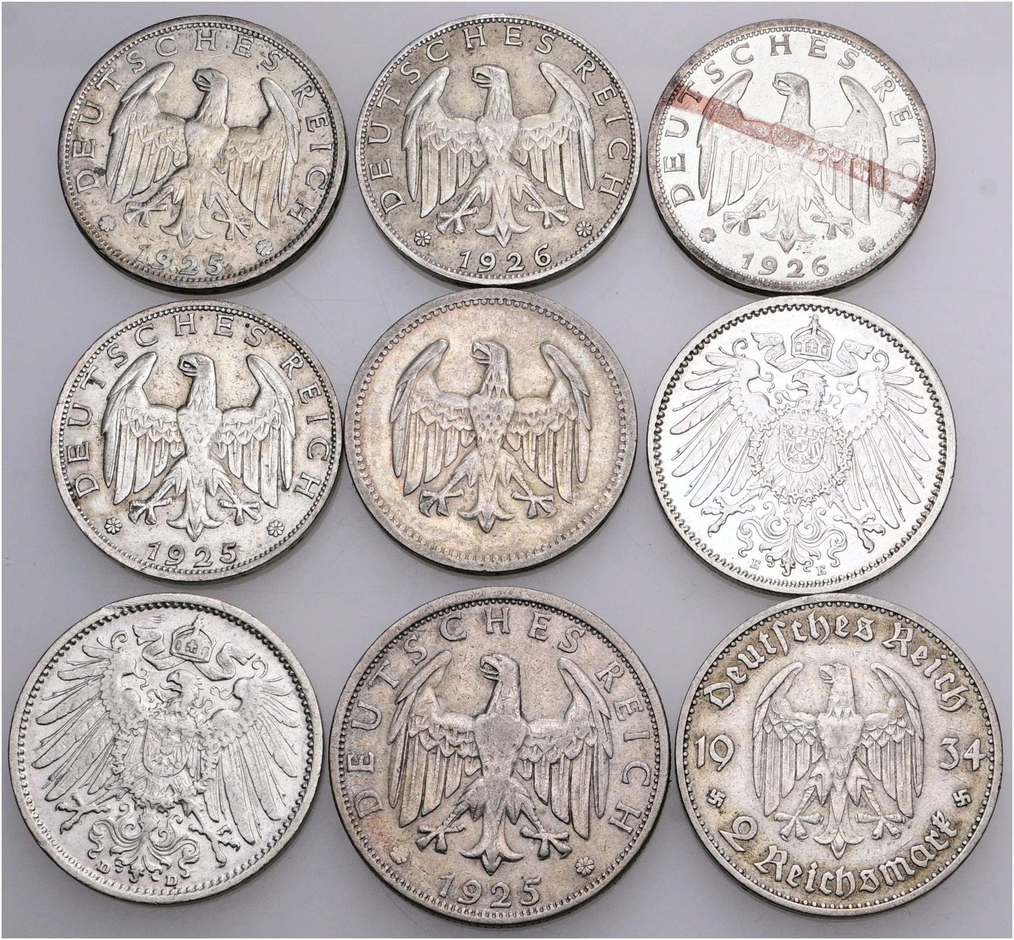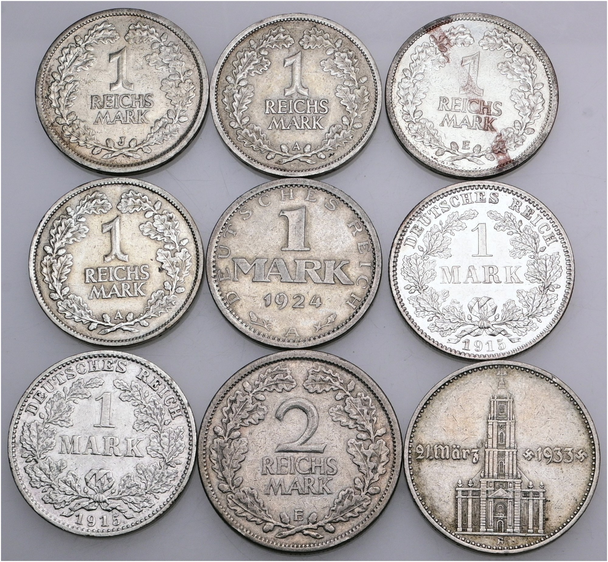 Mark 1915 D, E, 1924 A, Reichsmark 1925 A, J, 1926 A, E; 2 Reichsmark 1925 E, 1933 A. (9)