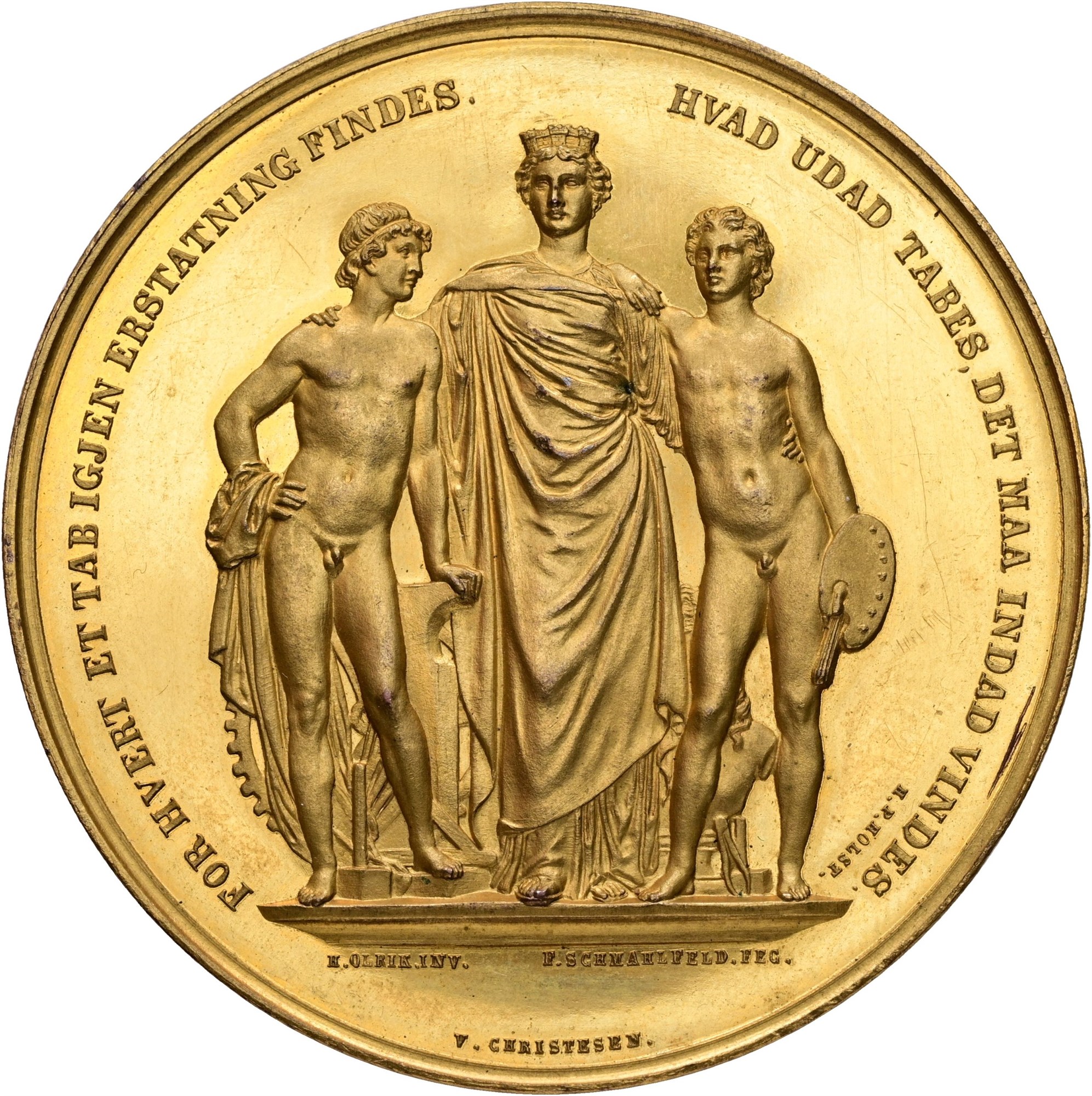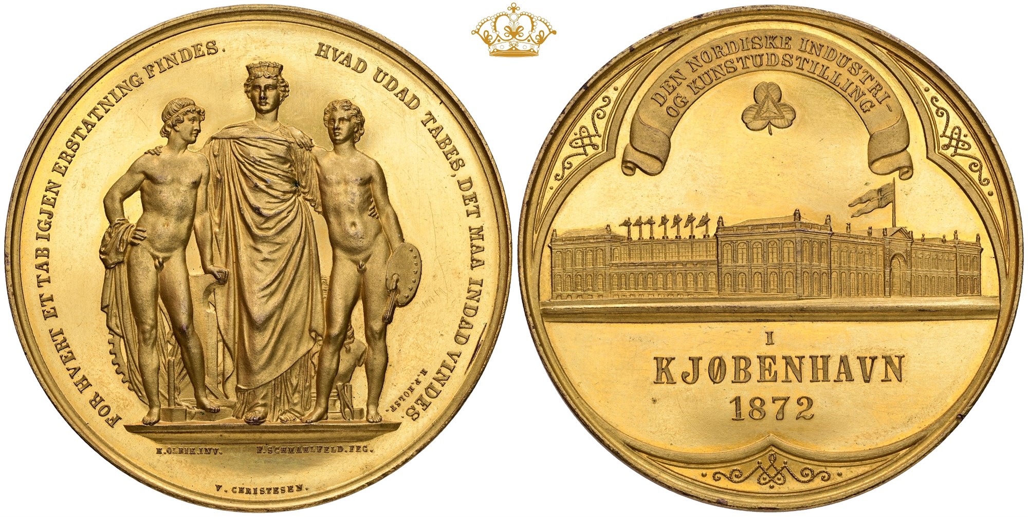 Den Nordiske Industri- og Kunstudstilling, 1872, af F. Schmalfeld og H. Olrik, forgyldt Sn, 54,5 mm - i gammel, defekt æske påtrykt "Raben-Levetzau, til Beldringe, Kammerherre".