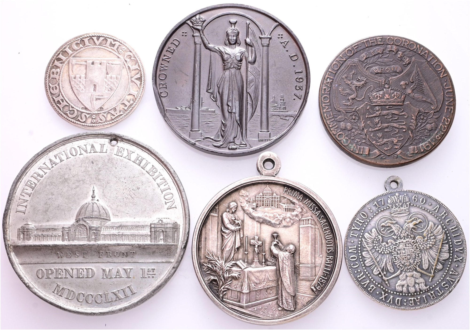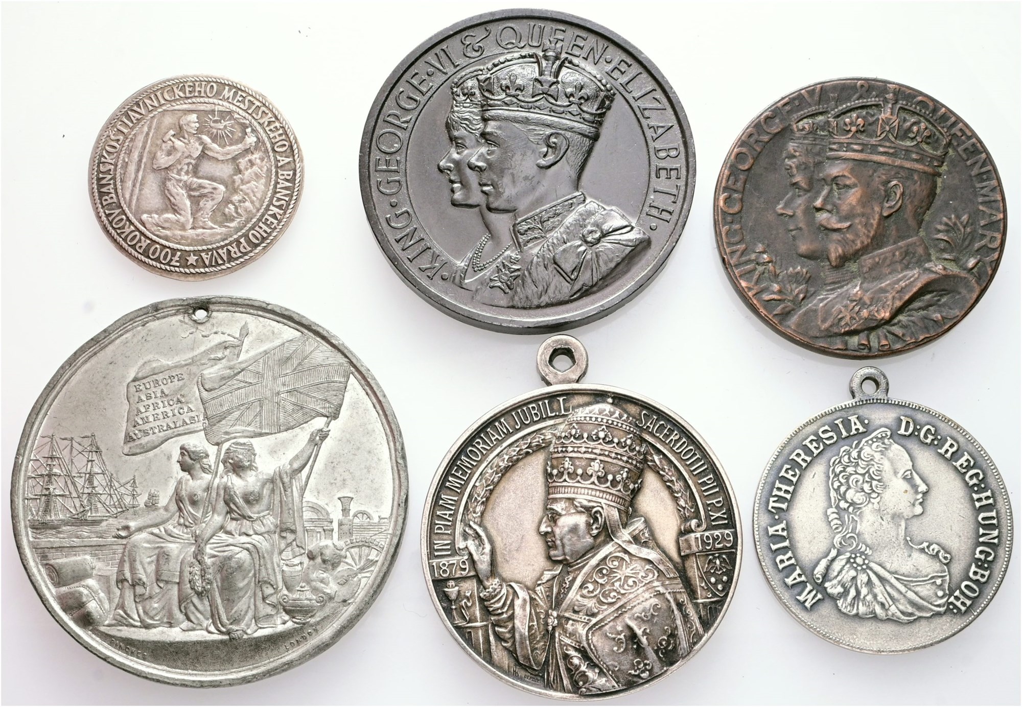Austria, Maria Theresia, ND (20th century); Czechoslovakia, 700 years of Banská Štiavnica municipal and mining law; Great Britain, International exhibition 1862; Coronation 1911; Coronation 1937; Italy, Pius XI, Golden Jubilee of Priesthood, 1929. (6)