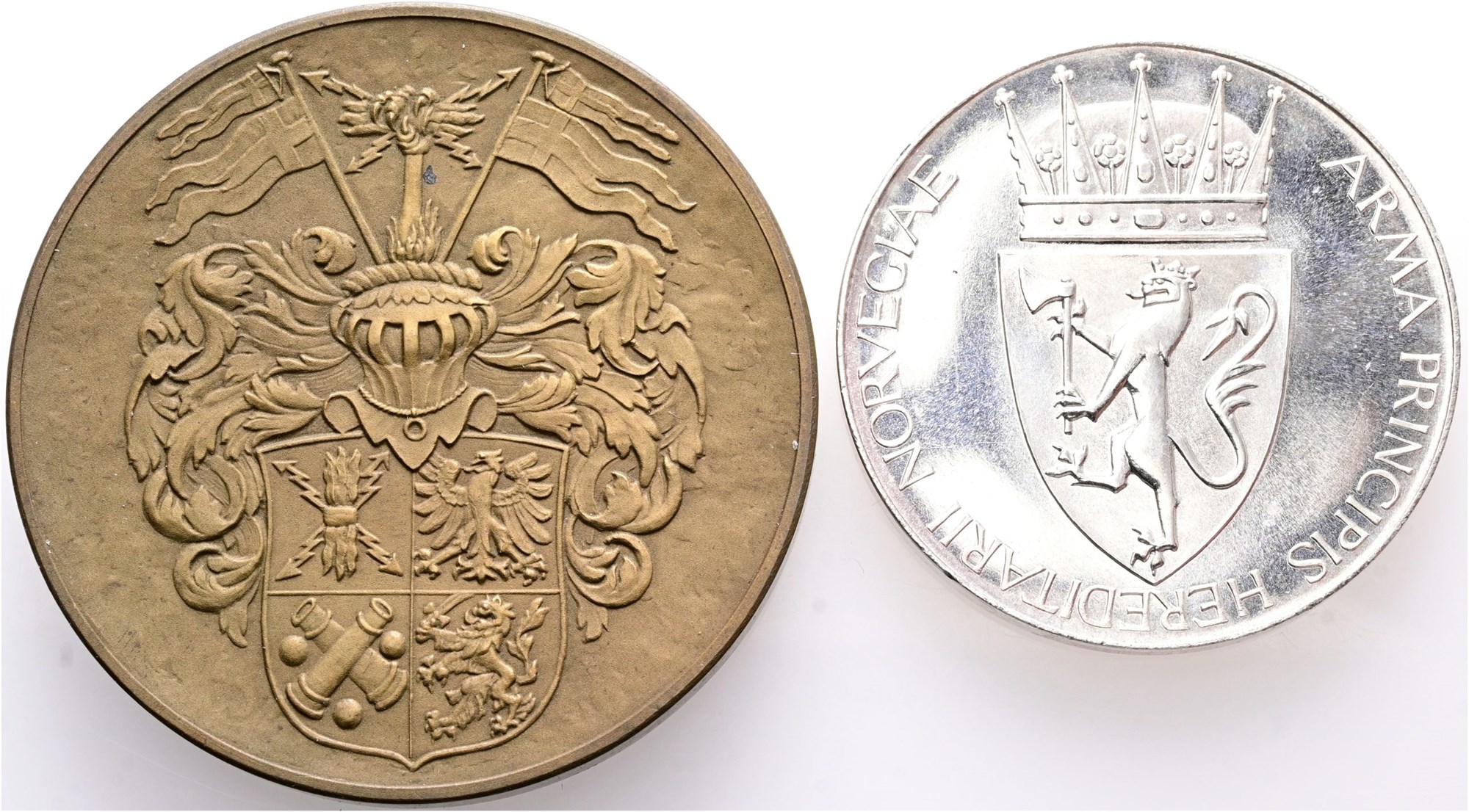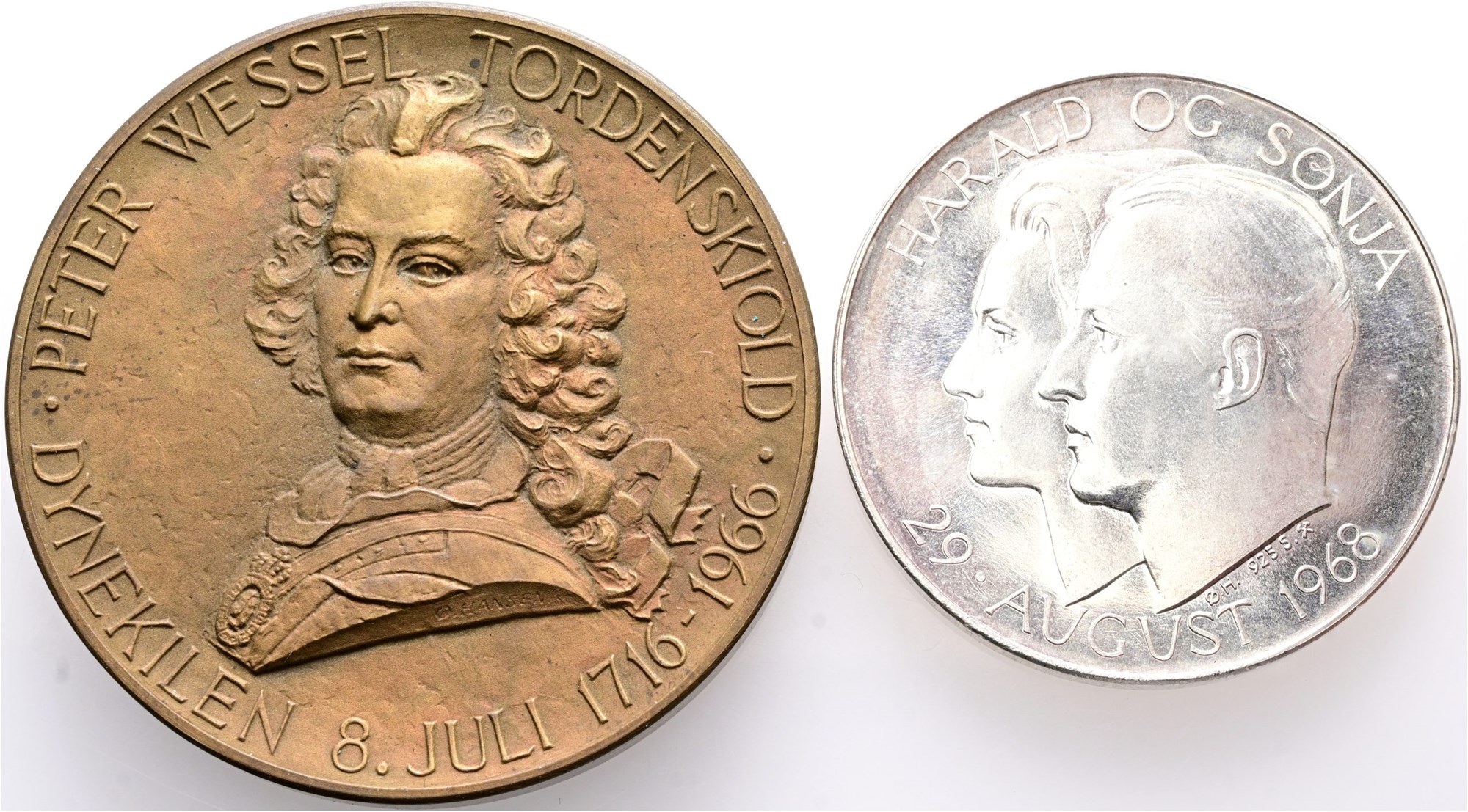 Harald og Sonja, bryllup, 1968, Ag (925/000), 35 mm, 19,93 g; Peter Wessel Tordenskjold, 1966, Ae, 45 mm, 46,84 g. (2)
