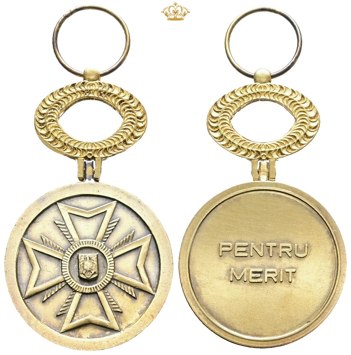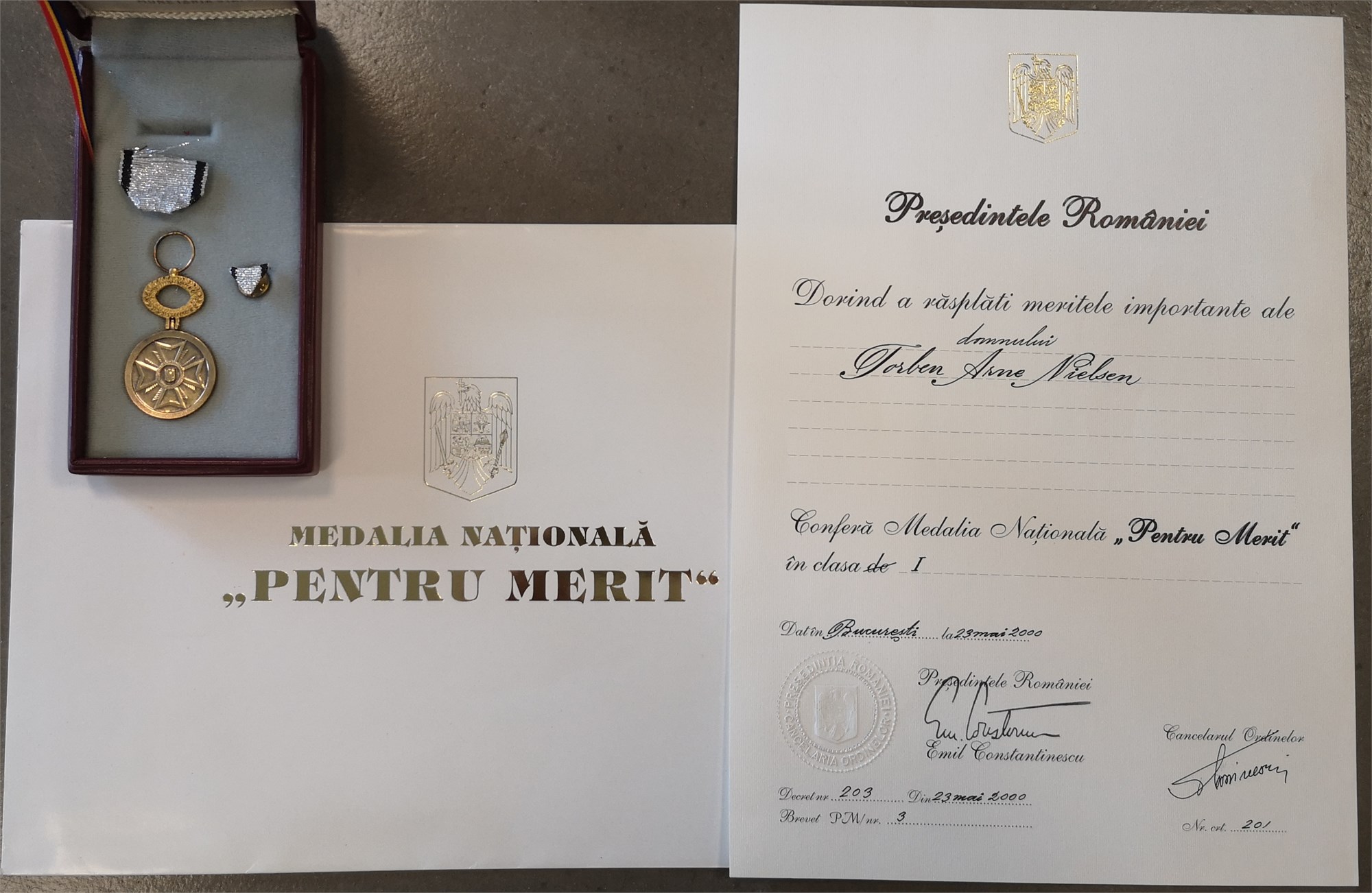 National Medal For Merit, First Class / 'Medalia națională "Pentru Merit", Clasa I', Ae, 35 mm - with original box of issue, pin and award document. Awarded to Torben Arne Nielsen, 23 May 2000.