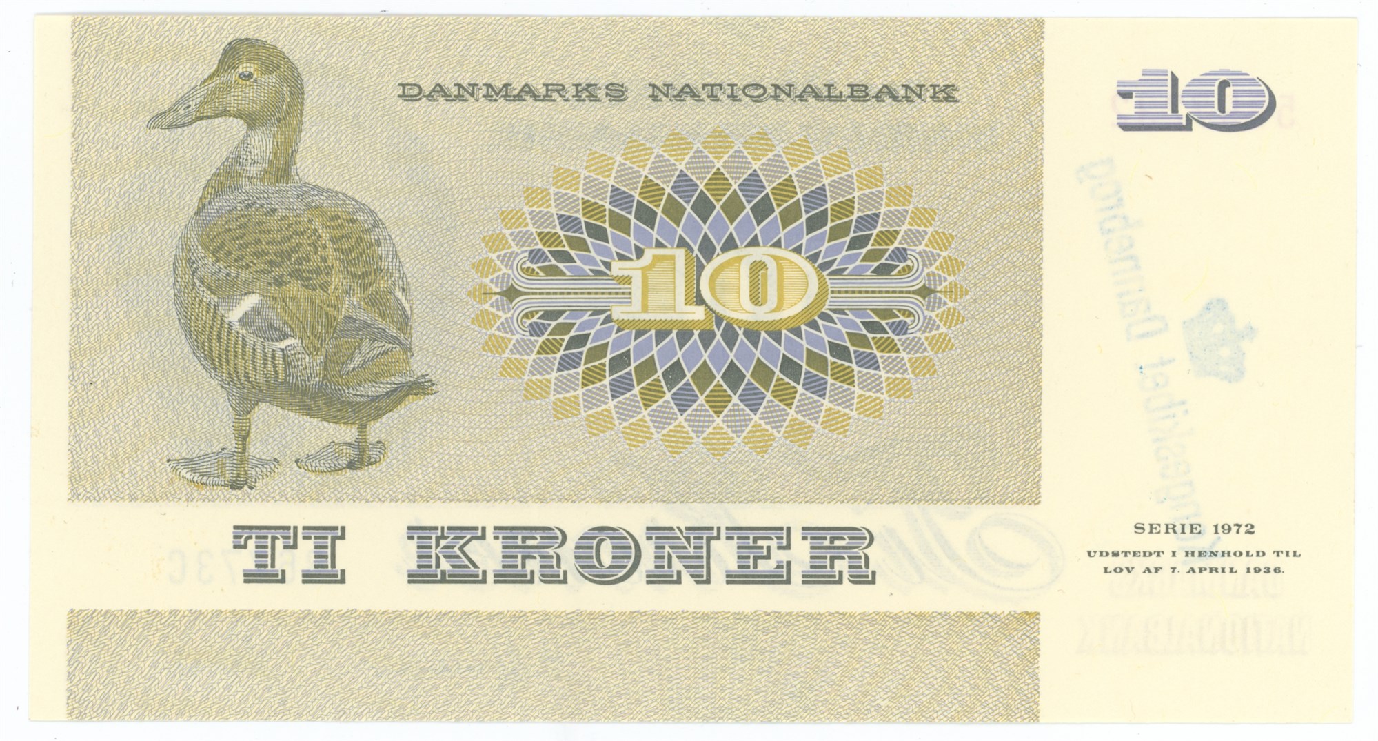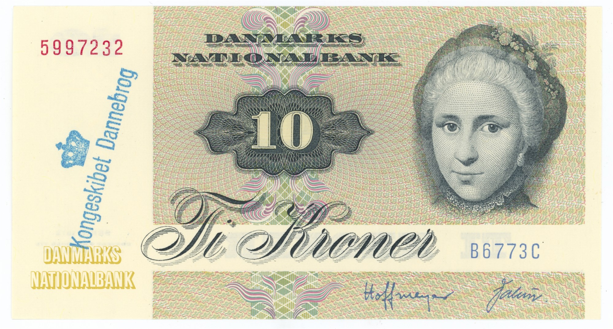 10 Kroner 1977 B6, nr. 5997232, Hoffmeyer / Valeur, påstemplet 'Kongeskibet Dannebrog'.