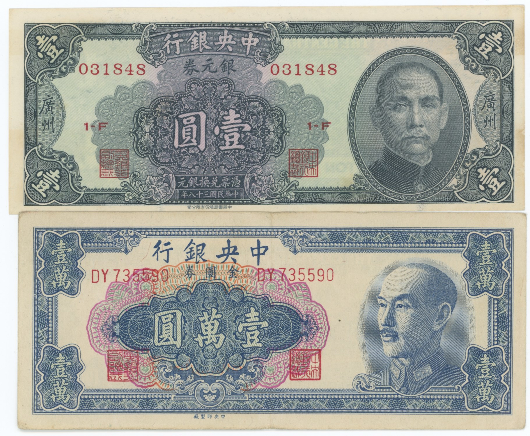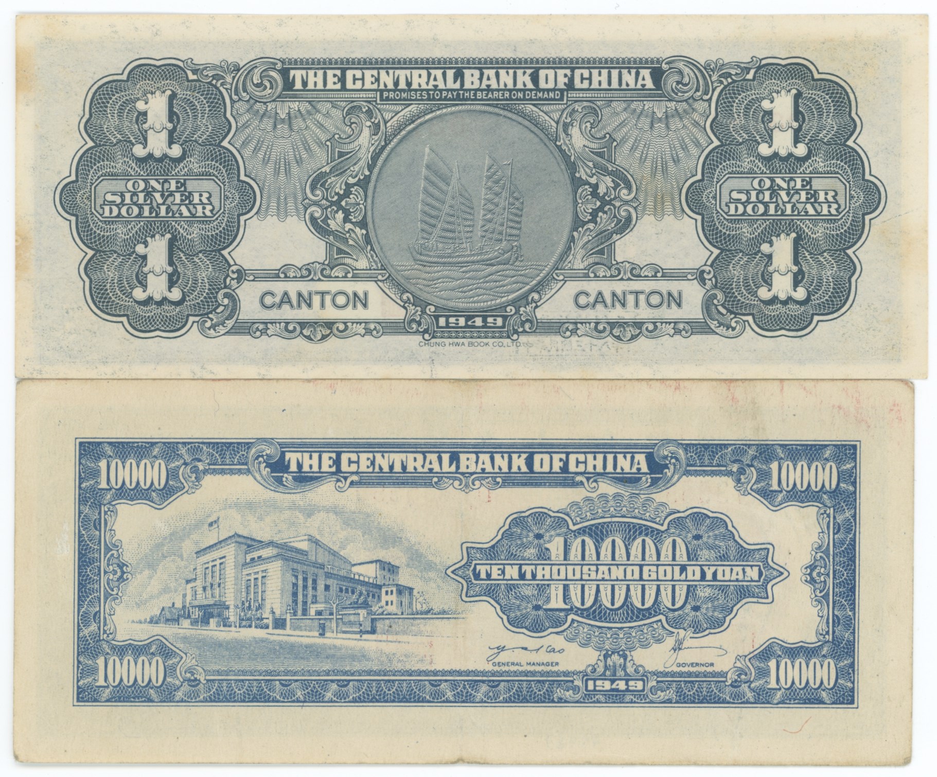 - Canton, 1 Dollar silver 1949 as well 10000 Yuan Gold certificate 1949. (2) (18083949)