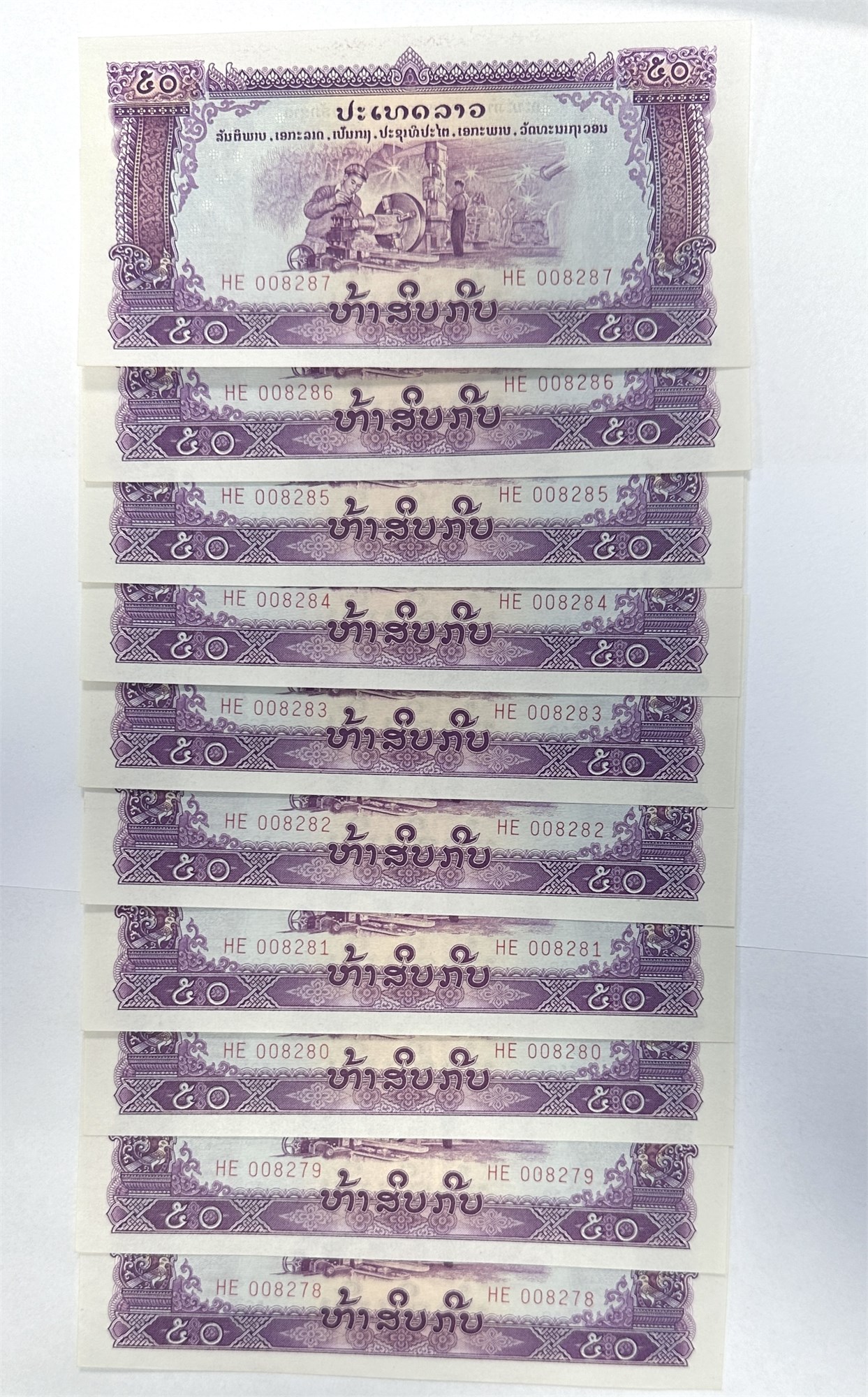 50 Kip ND, 10 pcs., concecutive numbers, no. HE 008278 - HE 008287. All but one UNC. (10)