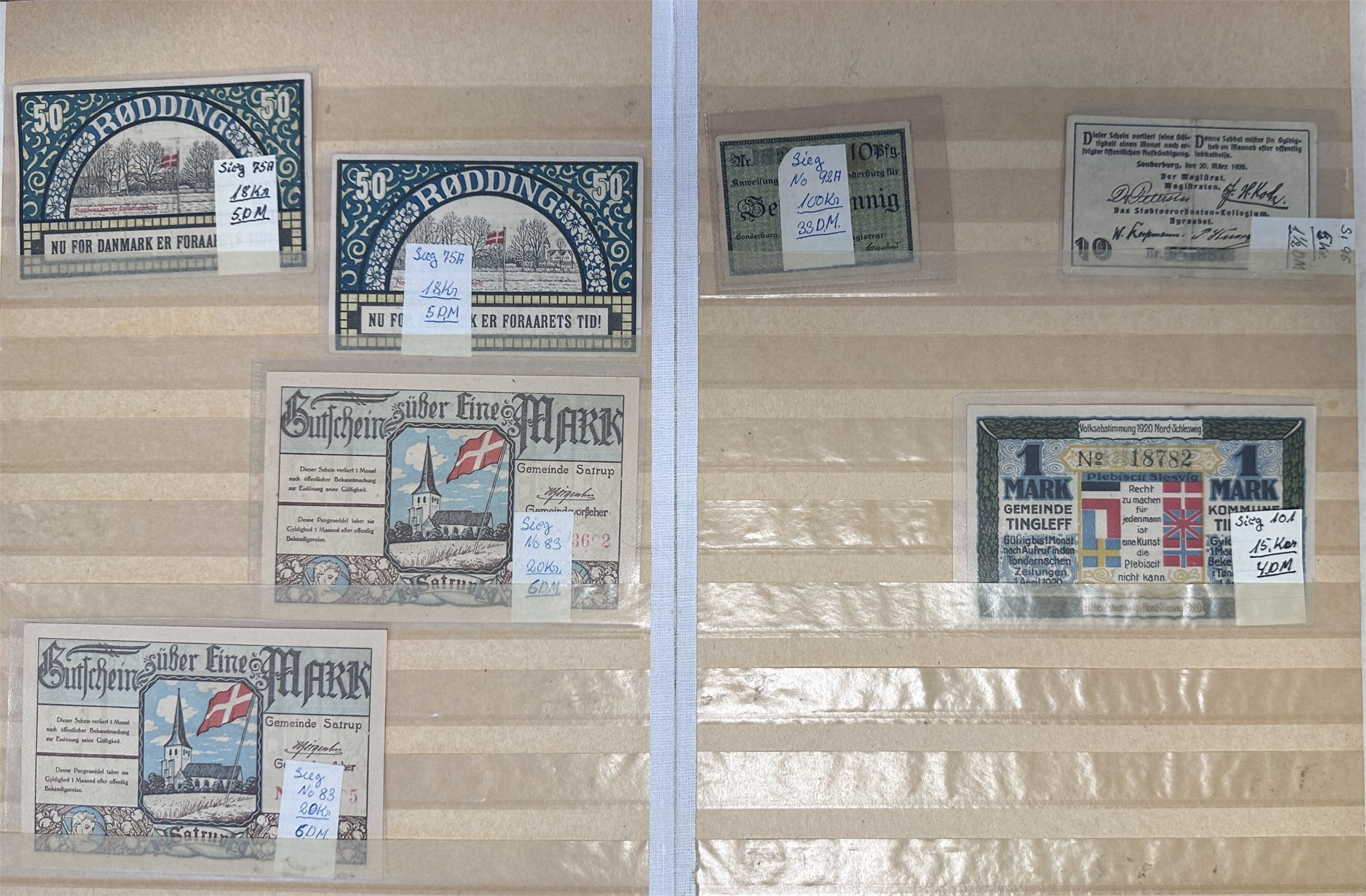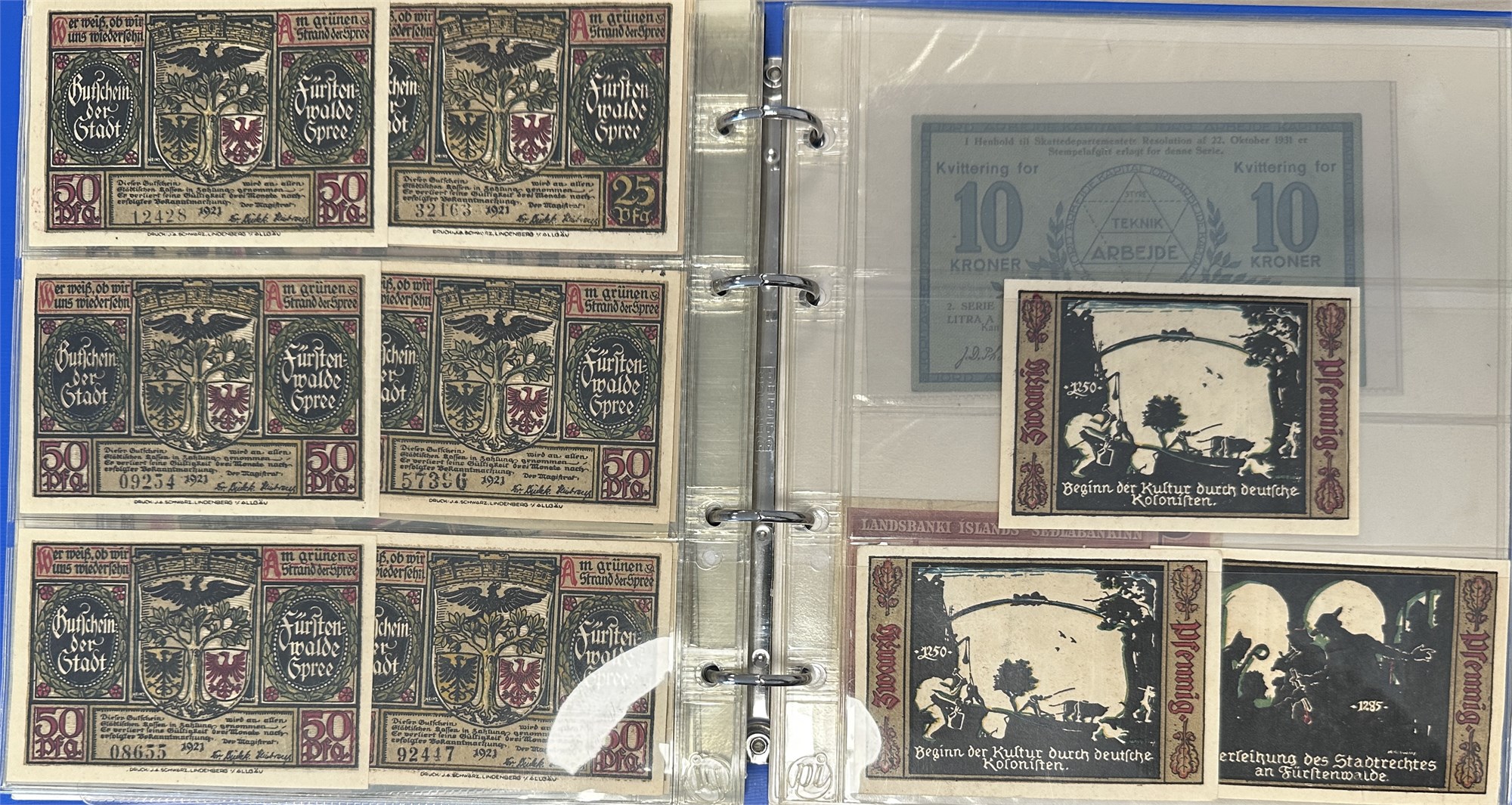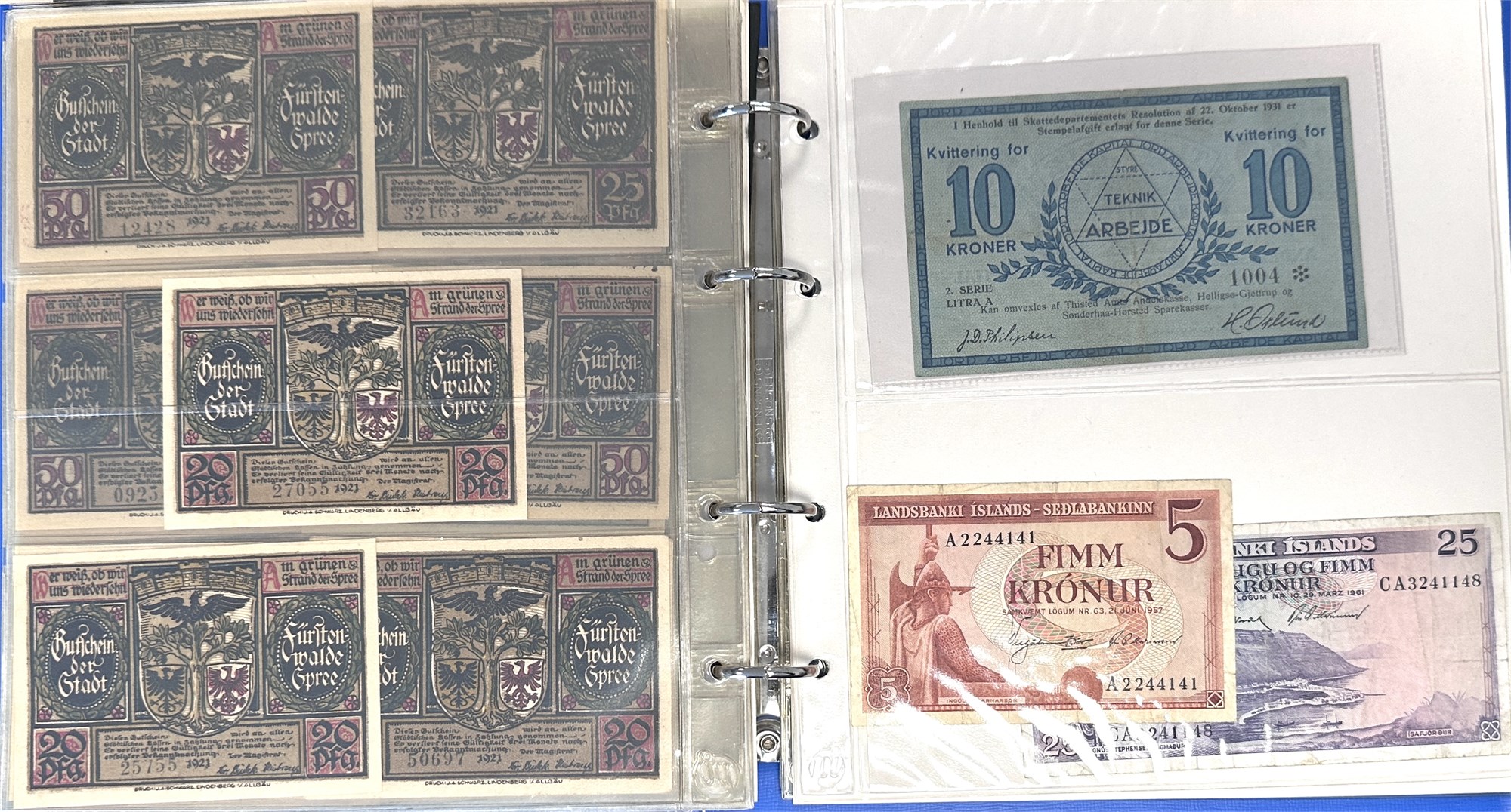 Samling div. i 2 albums, bl.a. Danmark, Island samt danske og tyske nødsedler, i alt mere end 100 stk. (+100)