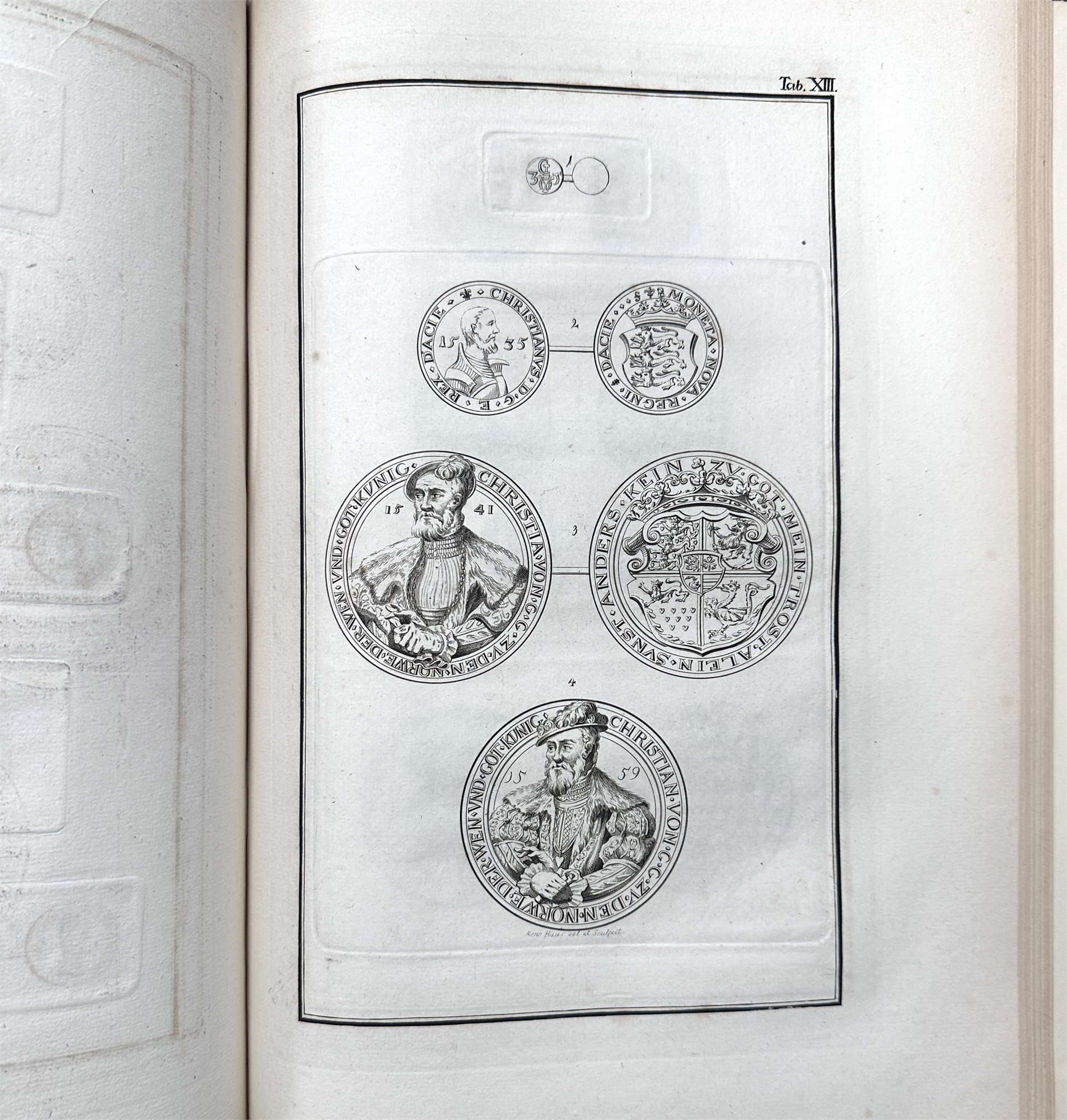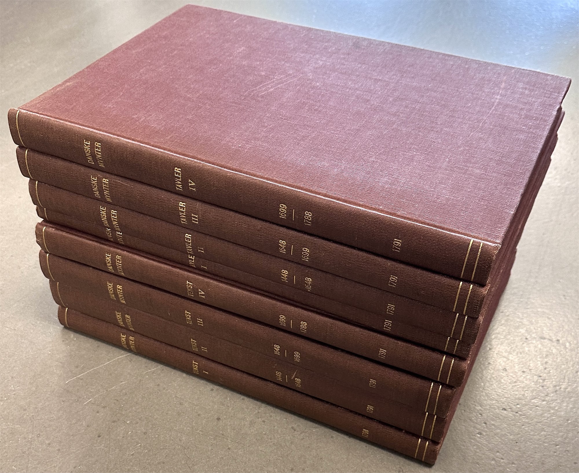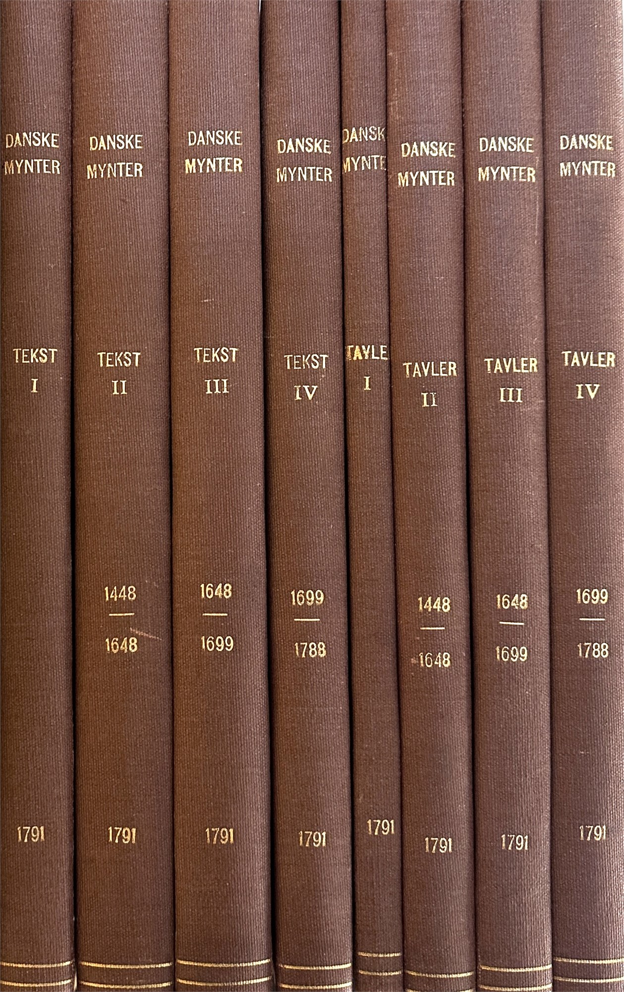 Beskrivelse over danske Mynter og Medailler i den kongelige Samling, Kbh. 1791. Elefantfolio. Pænt, komplet eksempar, hvor tekst- og tavledel hver er indbundet i fire bind. Totalt otte bind.