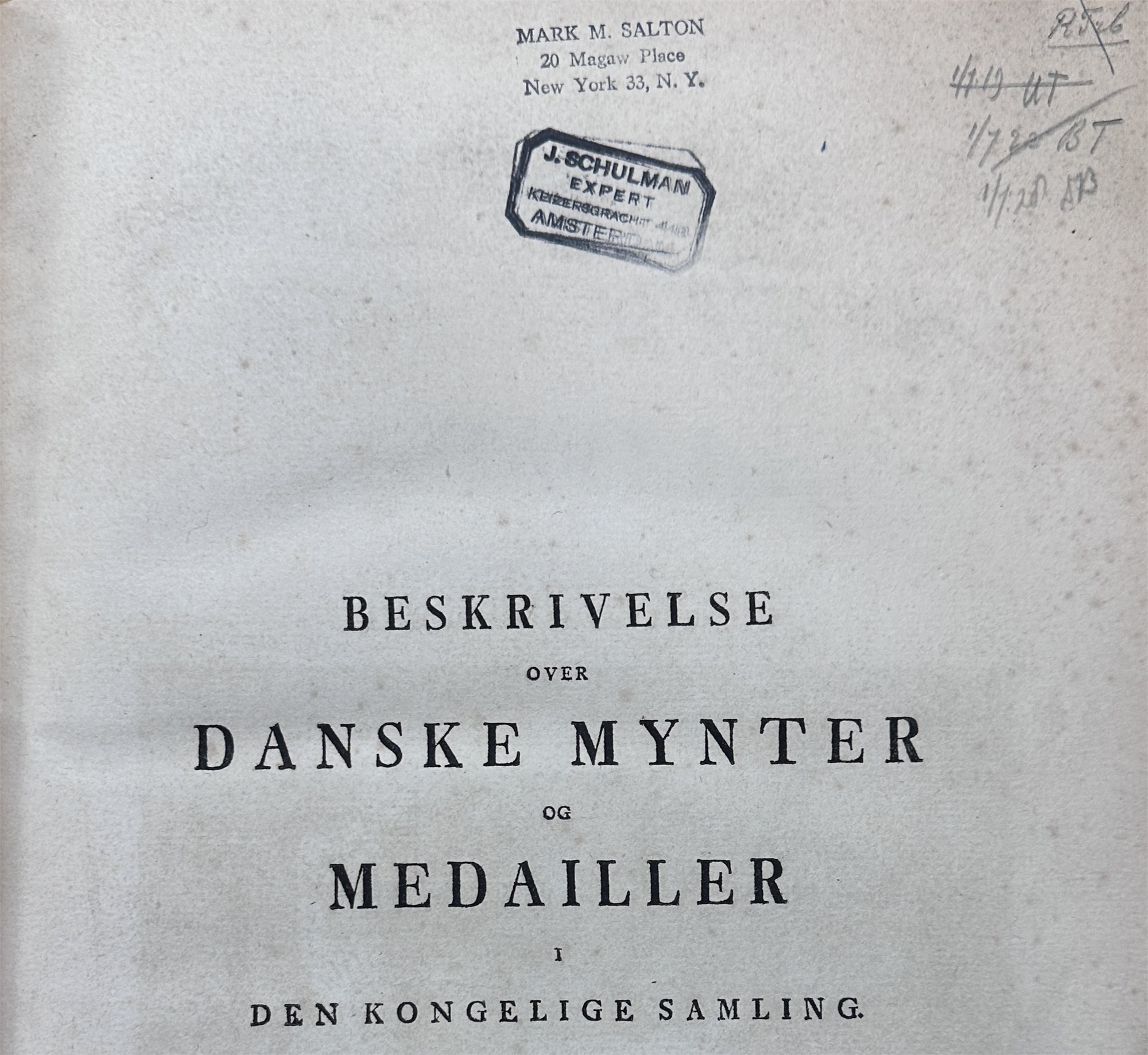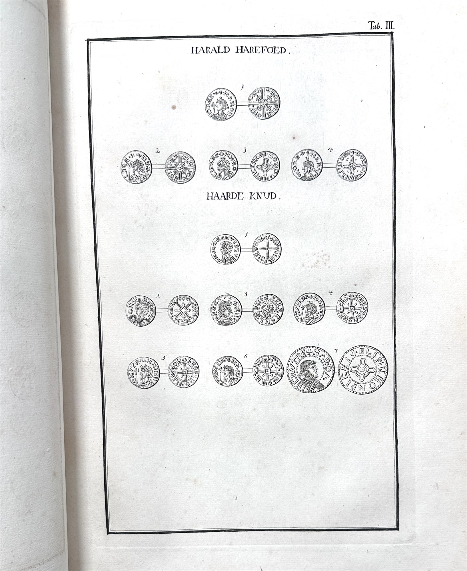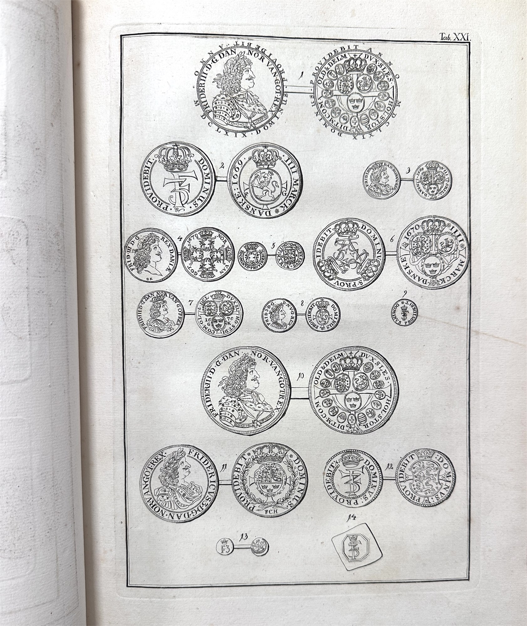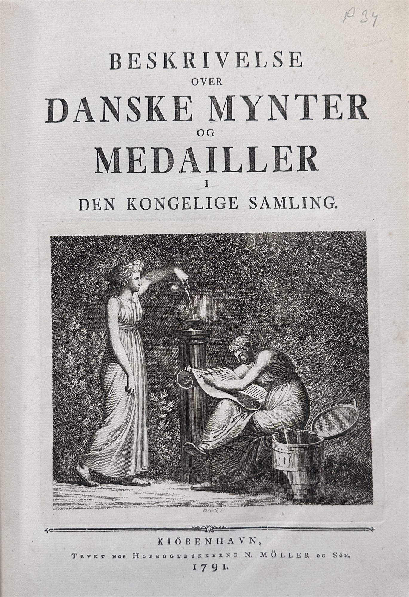 Beskrivelse over danske Mynter og Medailler i den kongelige Samling, Kbh. 1791. Elefantfolio. Pænt, komplet eksempar, hvor tekst- og tavledel hver er indbundet i fire bind. Totalt otte bind.